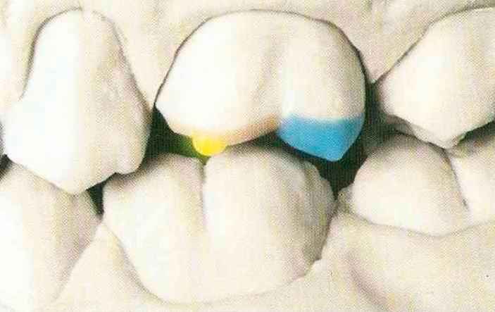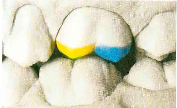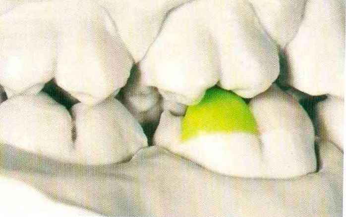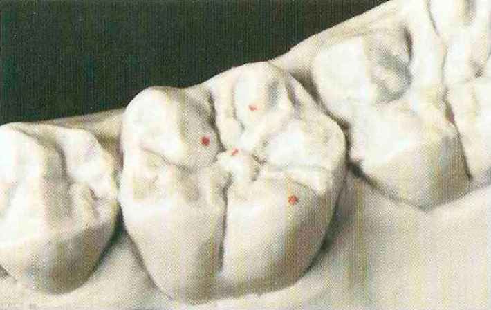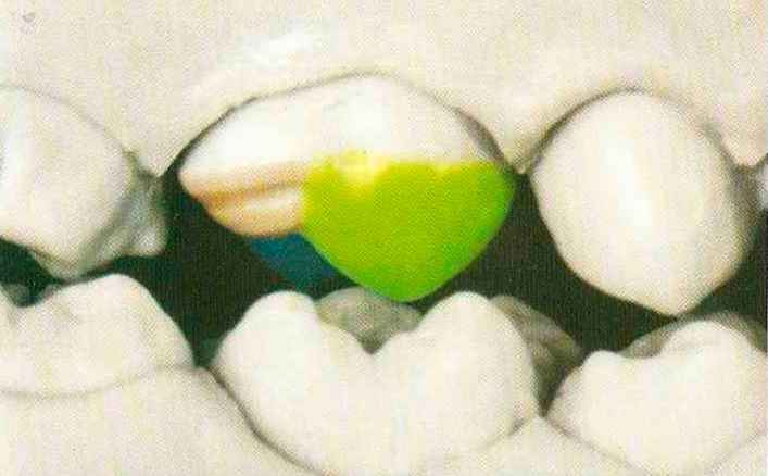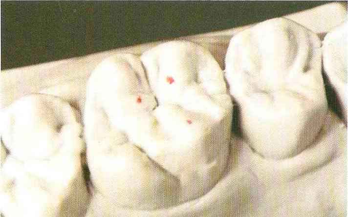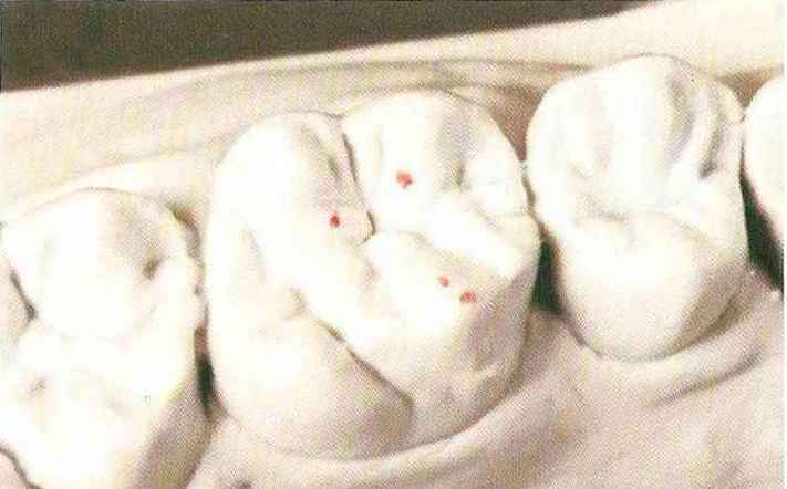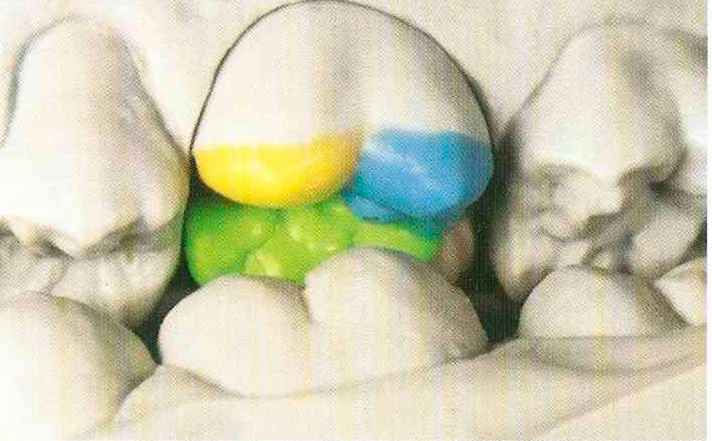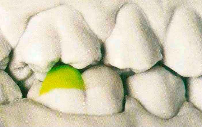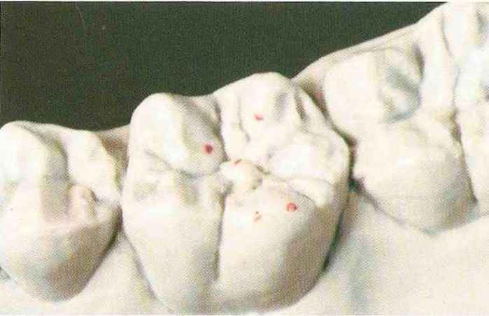 | выступающий элемент, который немного возвышается в дистально-щечном направлении от центральной ямки. На этом элементе находится первый контакт который обозначается № 9 (рис. 90 и 91) и отмечается на щечном треугольном выступе ниже вершины медиального небного бугорка (рис. 92-94). При анатомическом восковом моделировании этот контакт располагается строго на вершине конуса, в отличие от других методов воскового моделирования. Например, по методу Томаса |