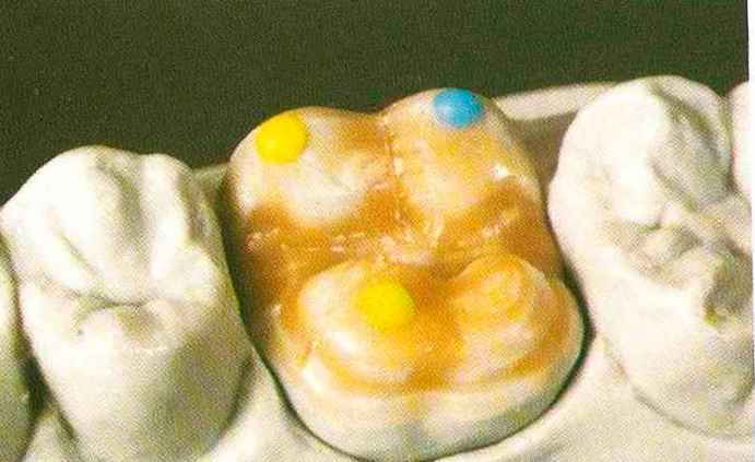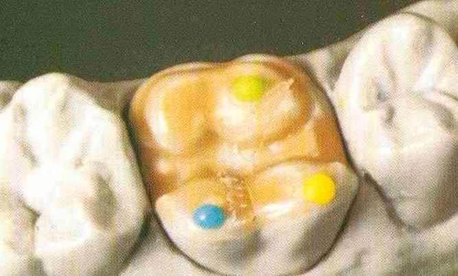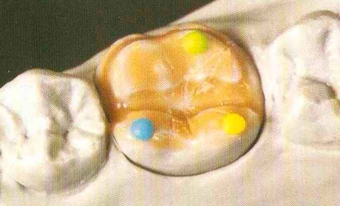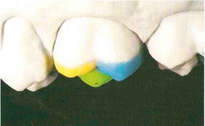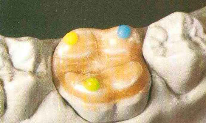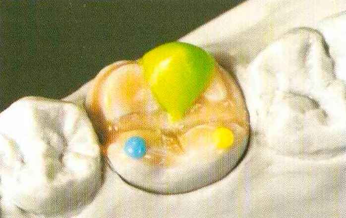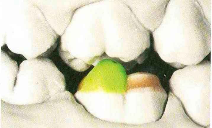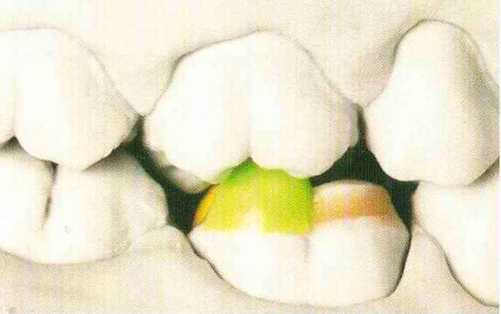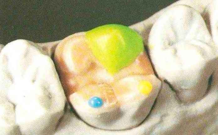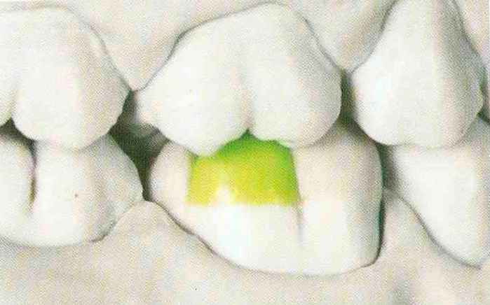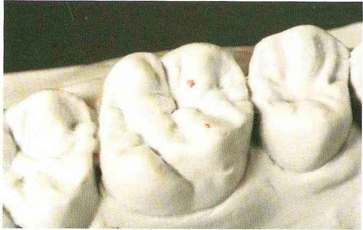 | выступающий элемент, который немного возвышается в дистально-щечном направлении от центральной ямки. На этом элементе находится первый контакт который обозначается № 9 (рис. 90 и 91) и отмечается на щечном треугольном выступе ниже вершины медиального небного бугорка (рис. 92-94). При анатомическом восковом моделировании этот контакт располагается строго на вершине конуса, в отличие от других методов воскового моделирования. Например, по методу Томаса |