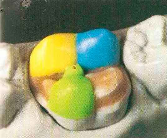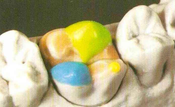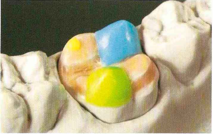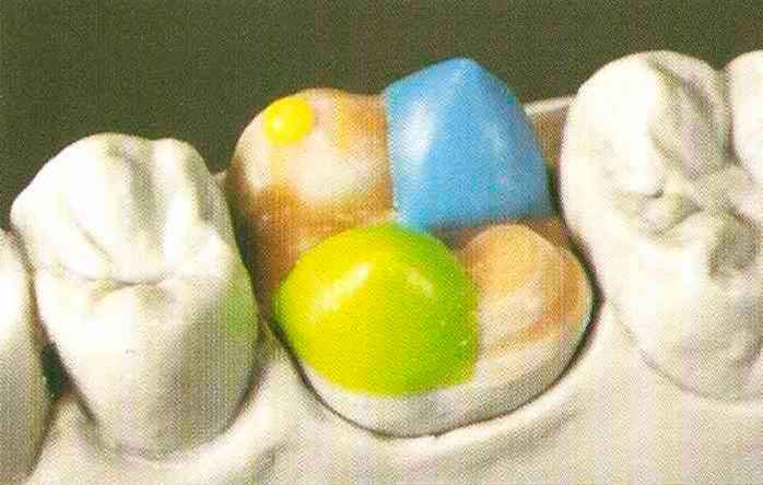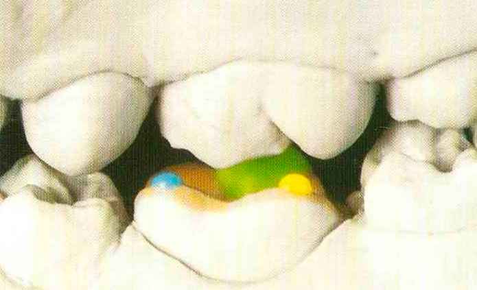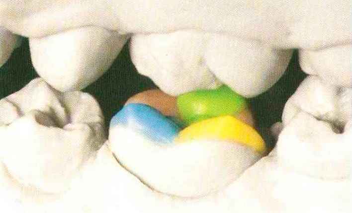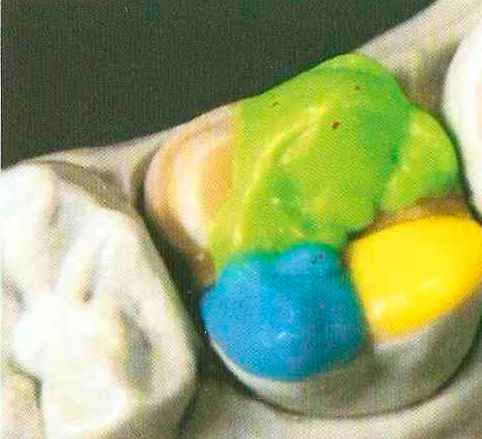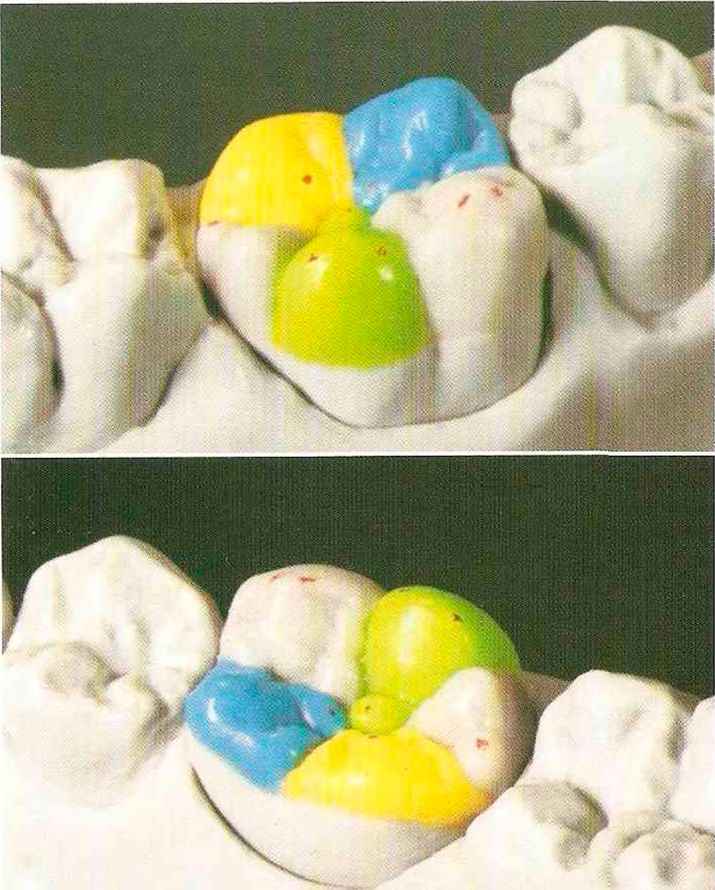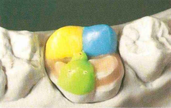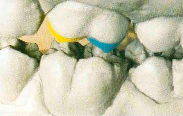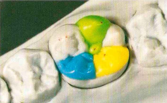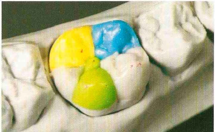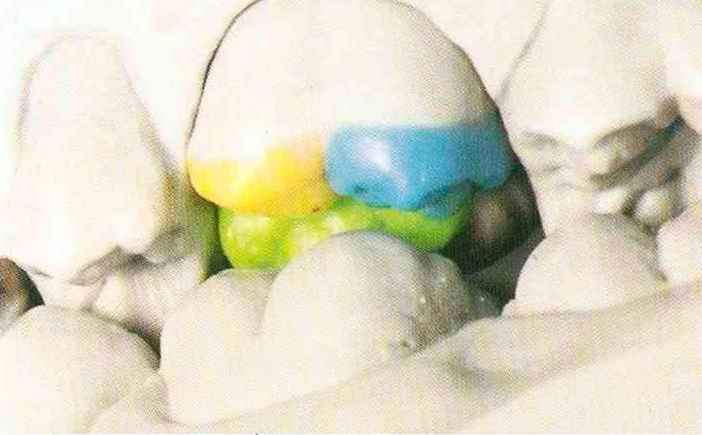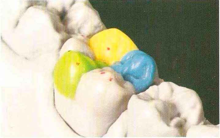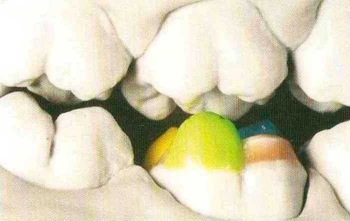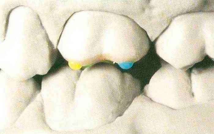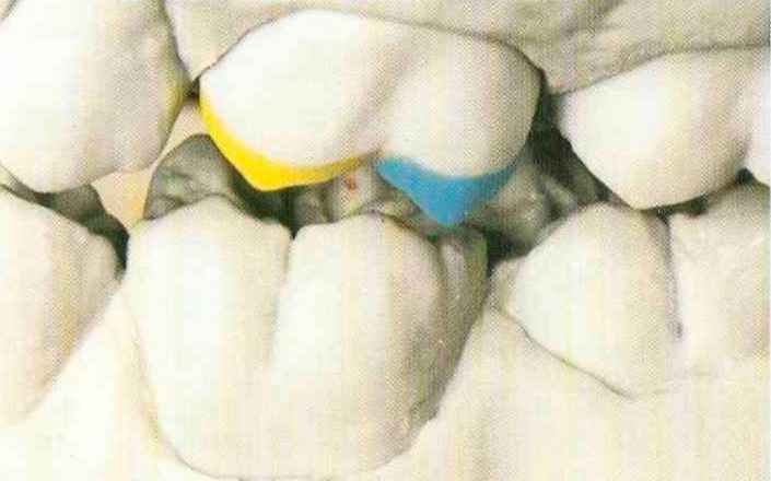 | Конусы располагают точно на линии латеропротрузии, чтобы движение проходило над вершинами соответствующих бугорков. Во избежание возникновения проблемных зон конусы можно моделировать немного короче, например, как синие конусы, и в дальнейшем - более пологими. Затем проводят повторную проверку модели в артикуляторе. Контактов с антагонистами в данный момент быть не должно, их создают только на последующих этапах. Для понимания дальнейших этапов необходимо усвоить практическую систему: вначале на одной половине модели выполняют восковое моделирование соответствующего элемента на верхнем моляре и контролируют возникающие при этом точки контакта на смоделированной поверхности и противоположных нижних зубах. Затем моделируют нижний моляр на противоположной стороне и прове- |