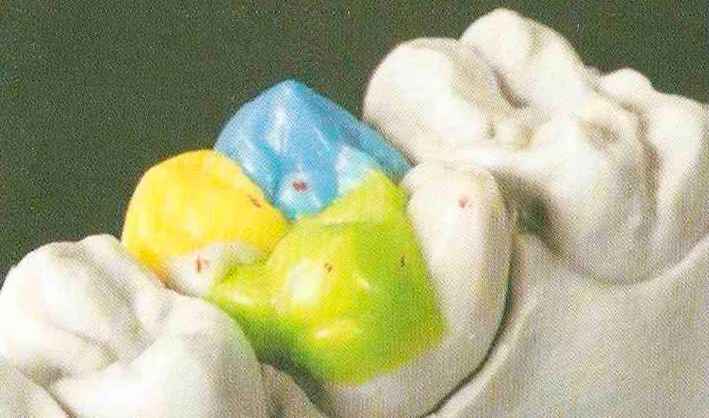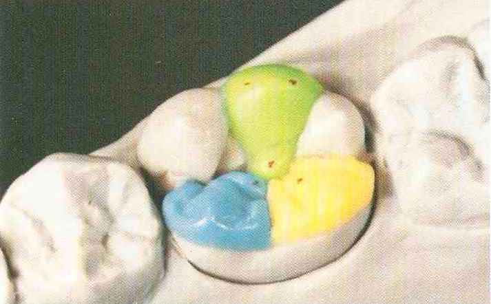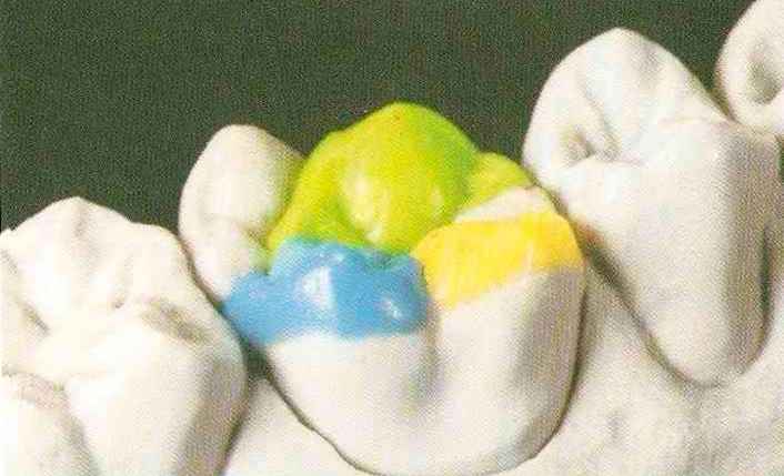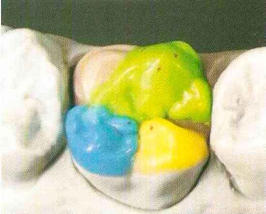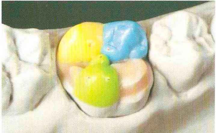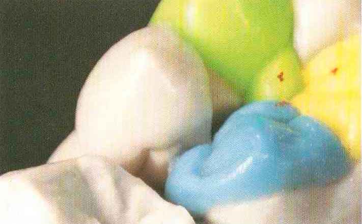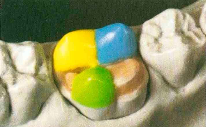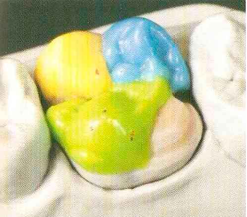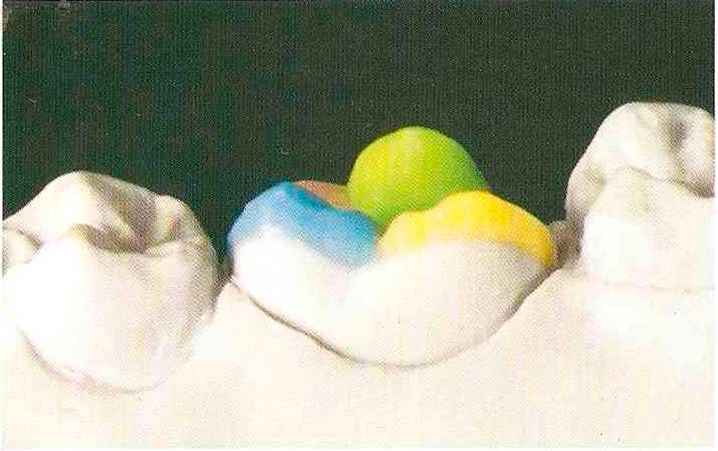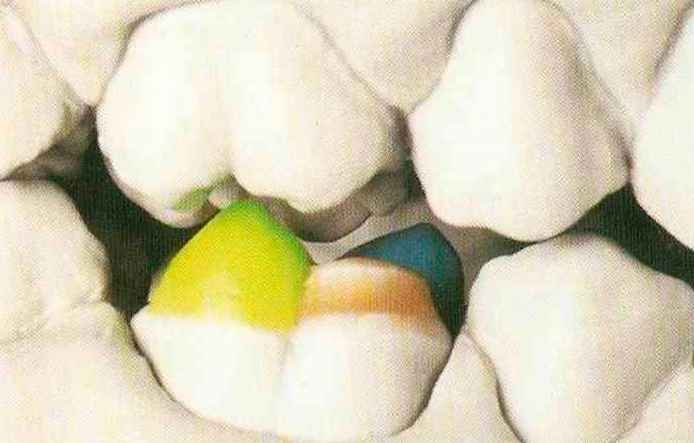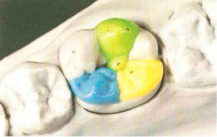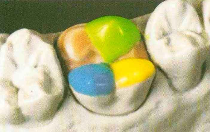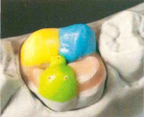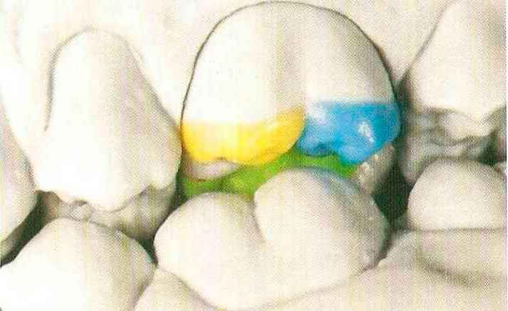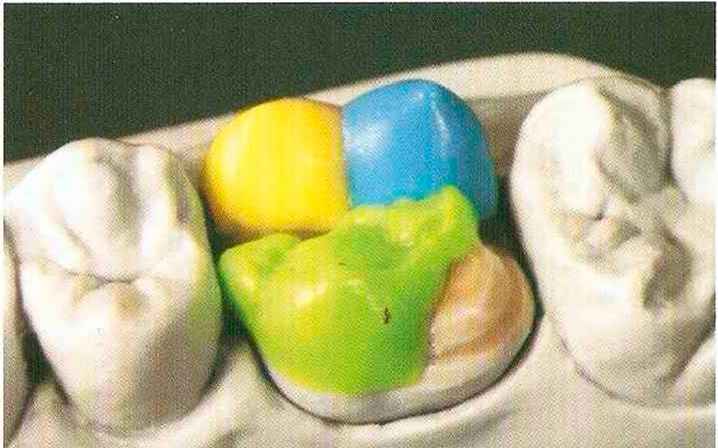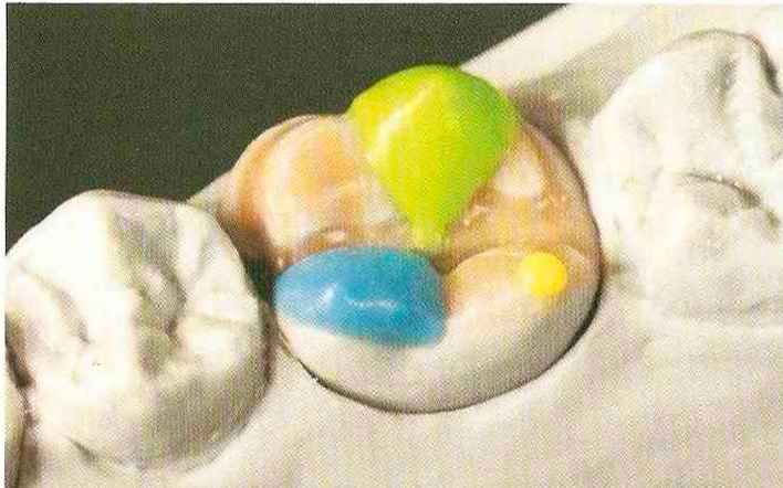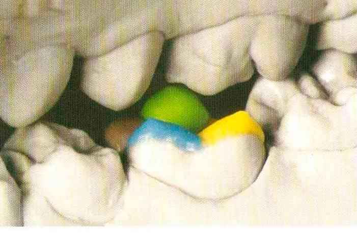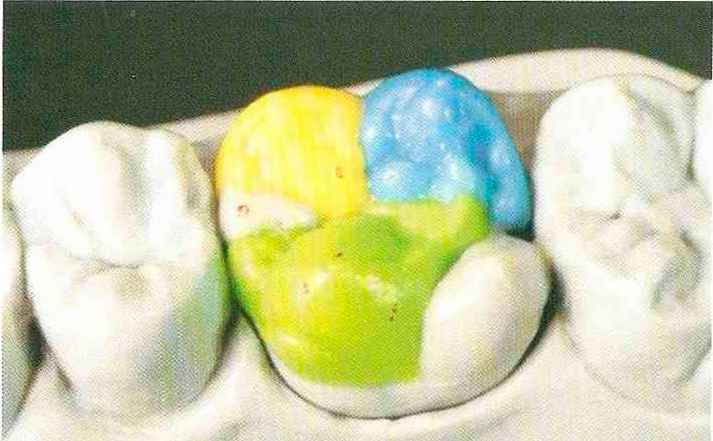 | Конусы располагают точно на линии латеропротрузии, чтобы движение проходило над вершинами соответствующих бугорков. Во избежание возникновения проблемных зон конусы можно моделировать немного короче, например, как синие конусы, и в дальнейшем - более пологими. Затем проводят повторную проверку модели в артикуляторе. Контактов с антагонистами в данный момент быть не должно, их создают только на последующих этапах. Для понимания дальнейших этапов необходимо усвоить практическую систему: вначале на одной половине модели выполняют восковое моделирование соответствующего элемента на верхнем моляре и контролируют возникающие при этом точки контакта на смоделированной поверхности и противоположных нижних зубах. Затем моделируют нижний моляр на противоположной стороне и прове- |