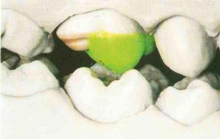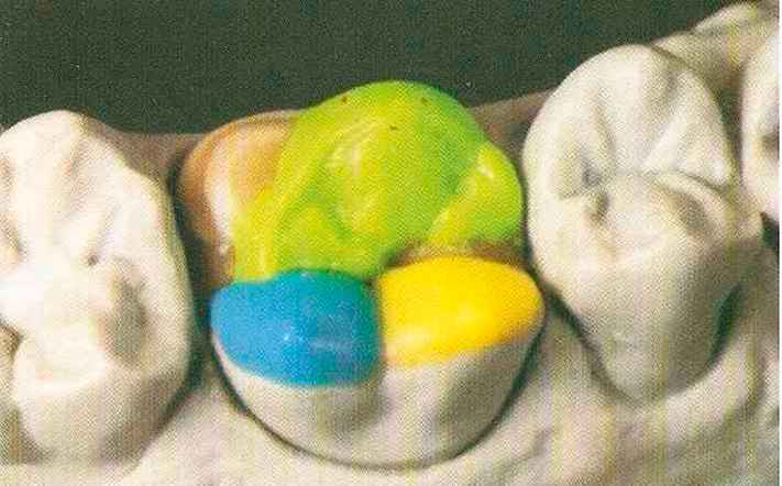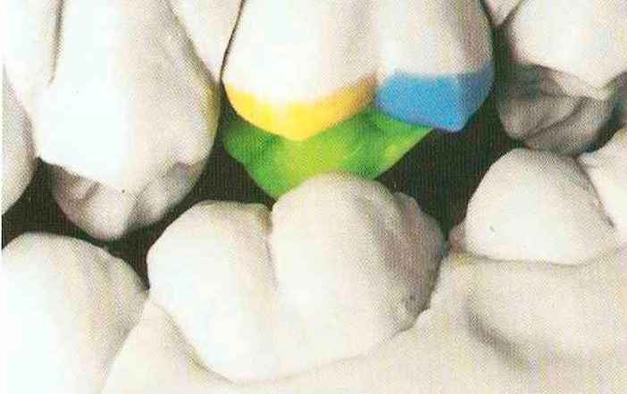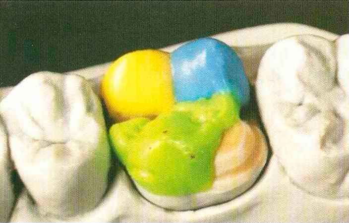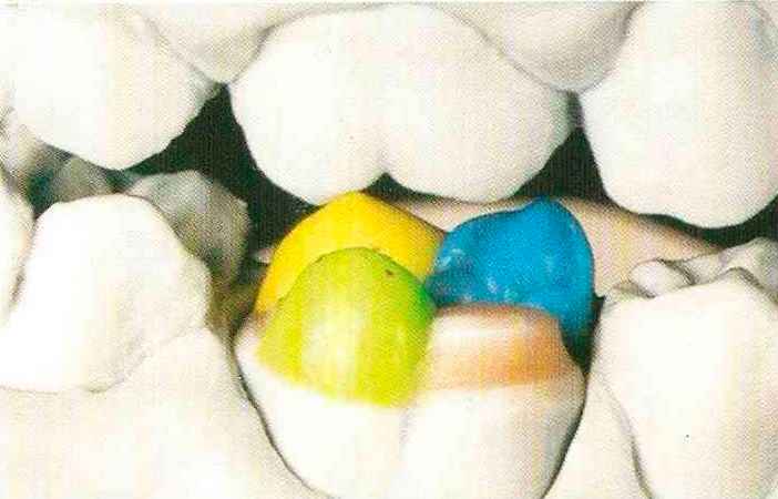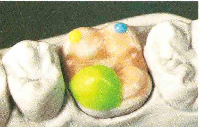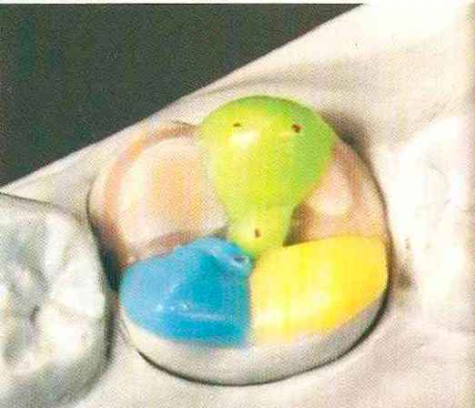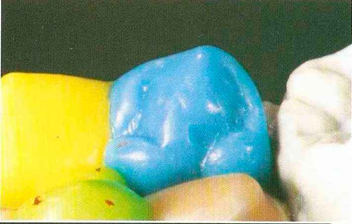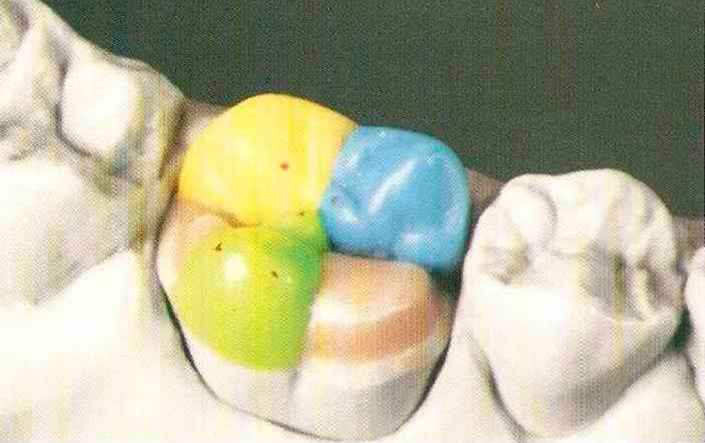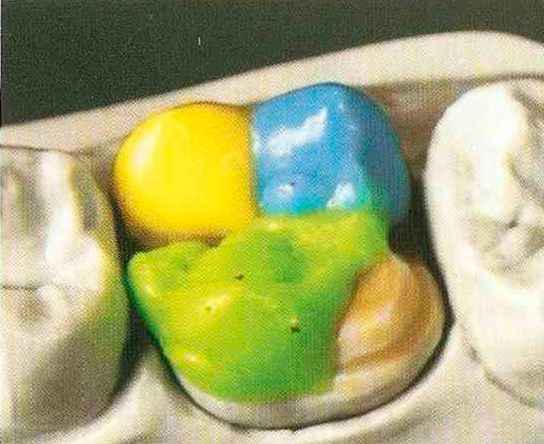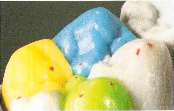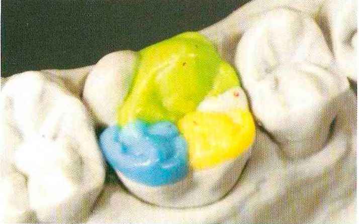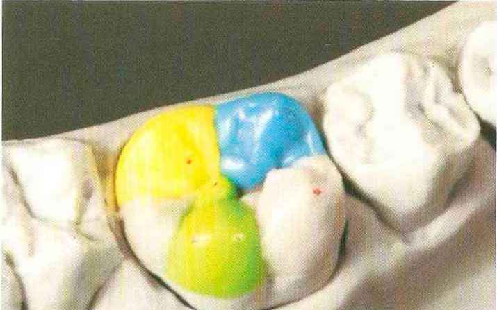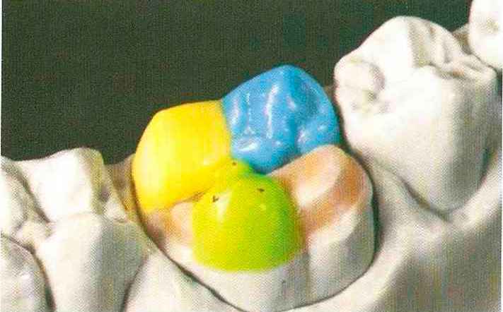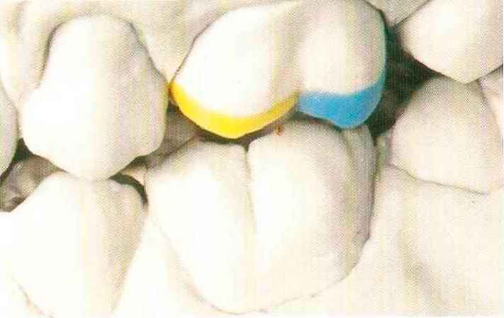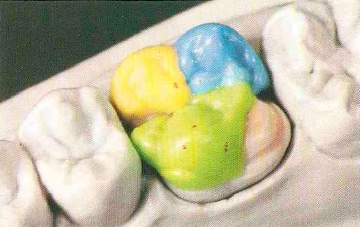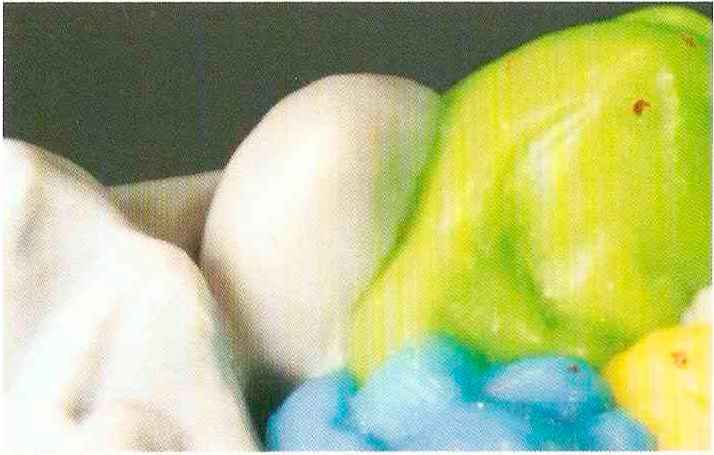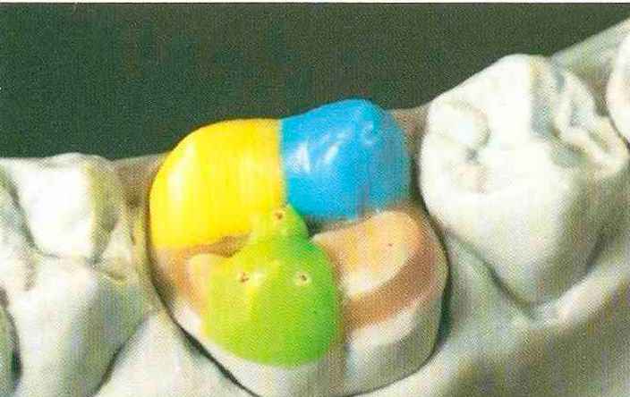 | Конусы располагают точно на линии латеропротрузии, чтобы движение проходило над вершинами соответствующих бугорков. Во избежание возникновения проблемных зон конусы можно моделировать немного короче, например, как синие конусы, и в дальнейшем - более пологими. Затем проводят повторную проверку модели в артикуляторе. Контактов с антагонистами в данный момент быть не должно, их создают только на последующих этапах. Для понимания дальнейших этапов необходимо усвоить практическую систему: вначале на одной половине модели выполняют восковое моделирование соответствующего элемента на верхнем моляре и контролируют возникающие при этом точки контакта на смоделированной поверхности и противоположных нижних зубах. Затем моделируют нижний моляр на противоположной стороне и прове- |