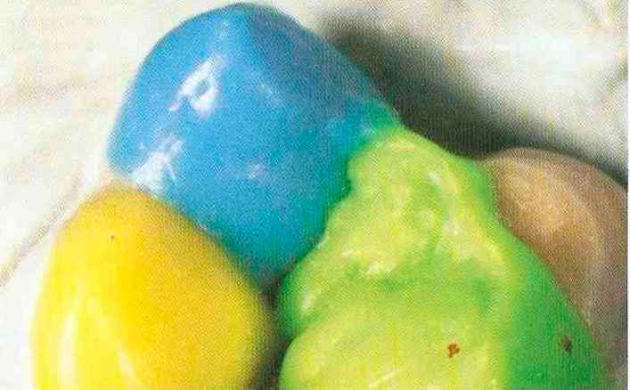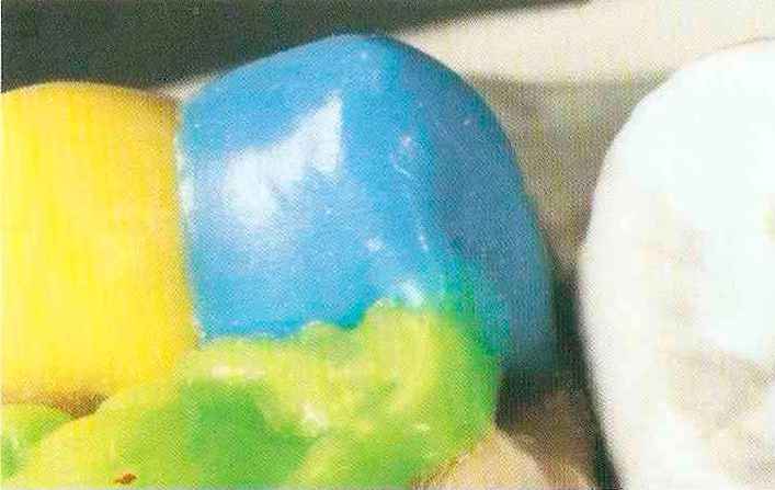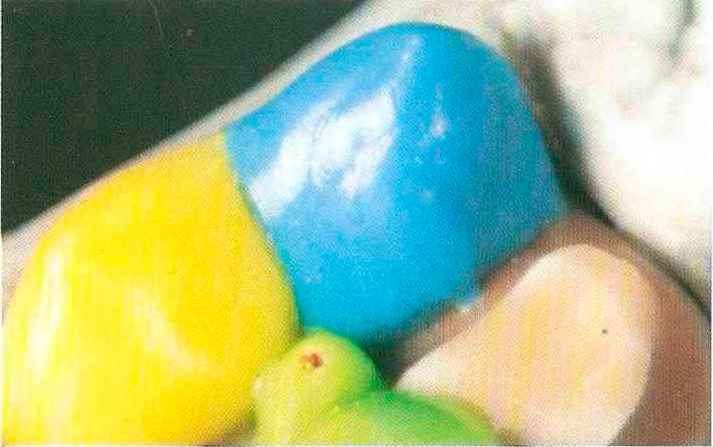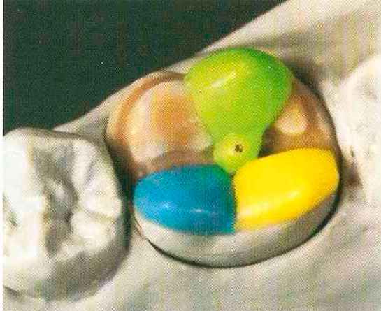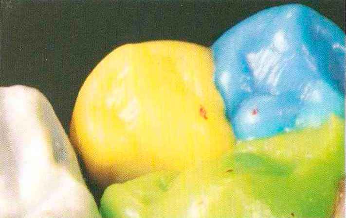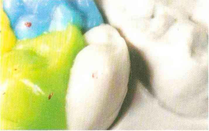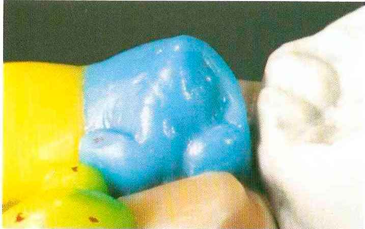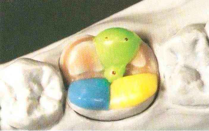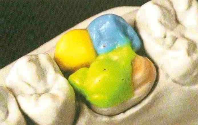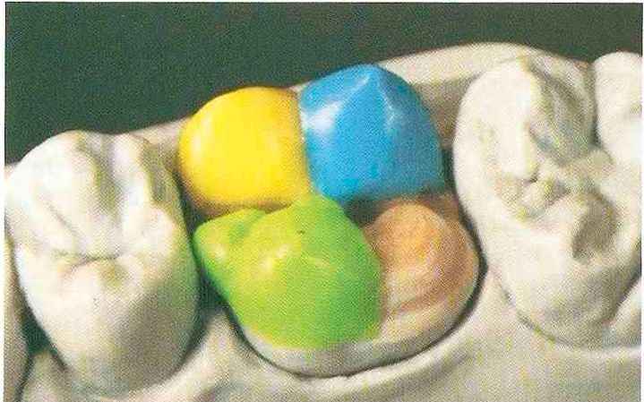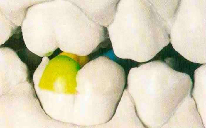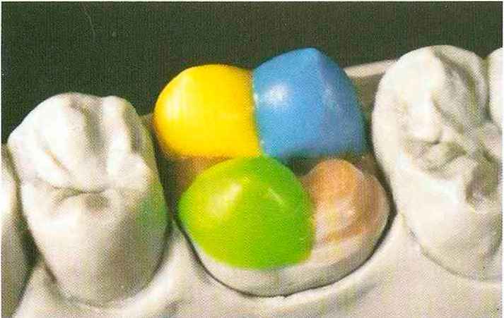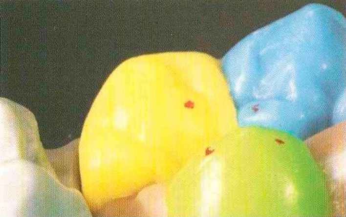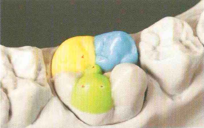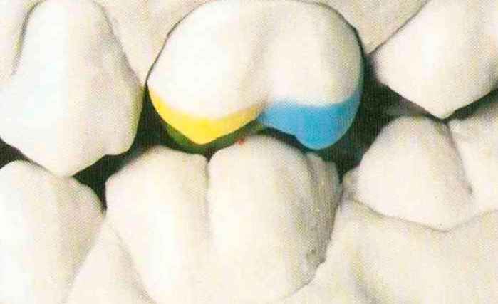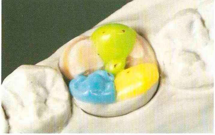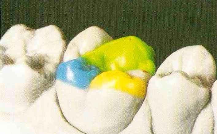 | Конусы располагают точно на линии латеропротрузии, чтобы движение проходило над вершинами соответствующих бугорков. Во избежание возникновения проблемных зон конусы можно моделировать немного короче, например, как синие конусы, и в дальнейшем - более пологими. Затем проводят повторную проверку модели в артикуляторе. Контактов с антагонистами в данный момент быть не должно, их создают только на последующих этапах. Для понимания дальнейших этапов необходимо усвоить практическую систему: вначале на одной половине модели выполняют восковое моделирование соответствующего элемента на верхнем моляре и контролируют возникающие при этом точки контакта на смоделированной поверхности и противоположных нижних зубах. Затем моделируют нижний моляр на противоположной стороне и прове- |