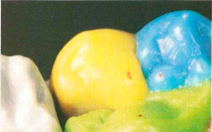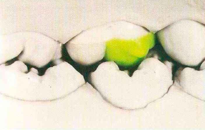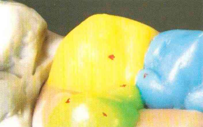 | нус) на верхней челюсти и дистальный щечный бугорок (гипоконид) на нижней челюсти. Последний располагается позади пограничной области немедленного бокового смещения (НБС). Вершины бугорков нельзя моделировать в пограничных областях. Эти бугорки являются опорными, поэтому их вершины немного смещены от края к центральной ямке. | Желтым воском моделируют на верхней челюсти и на нижней челюсти. Капли точно наносят на желтой линии латеропро-трузии со значительным смещением от центральной части зуба к периферии, поскольку этот бугорок является неопорным (рис. 46-49). |