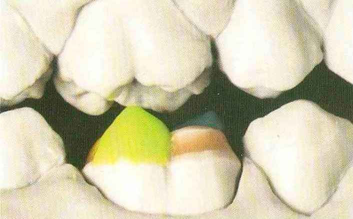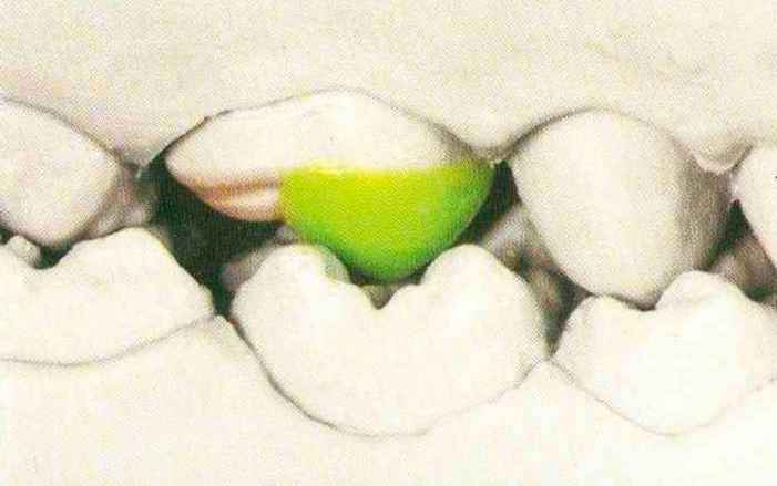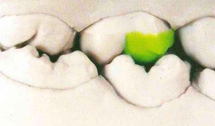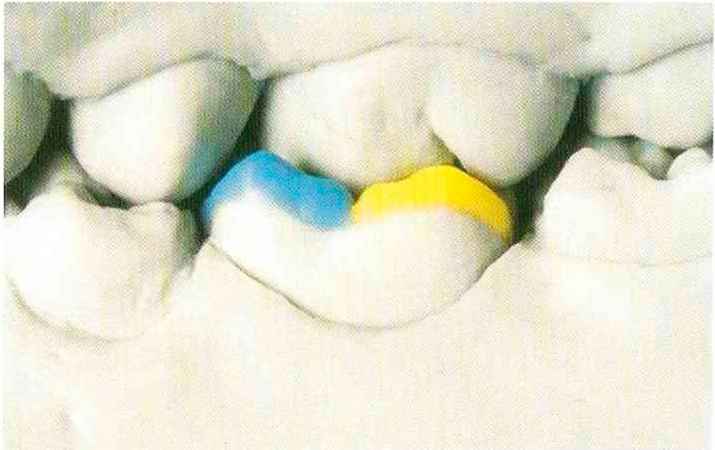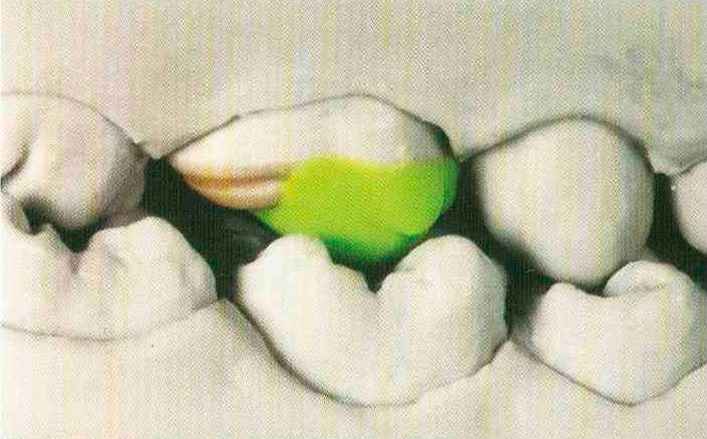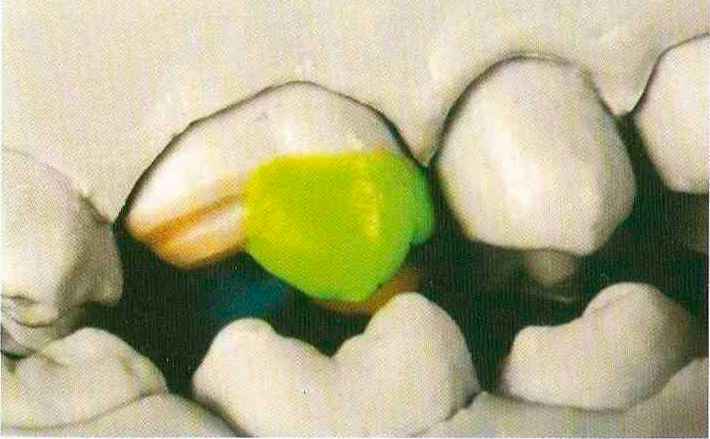 Рис. 115. ...и дистапь-ный эмалевый гребень, который переходит в дистальный добавочный выступ. В данной ситуации невозможно создать контакт № 2 |
