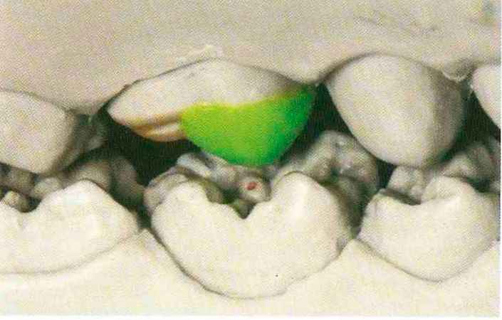 Рис. 68. Проверка с щечной стороны. Во избежание возни кновения препятствий при латеро-протрузии медиальный щечный бугорок моделируют более коротким, чем дистальный щечный бугорок |