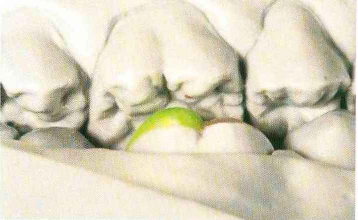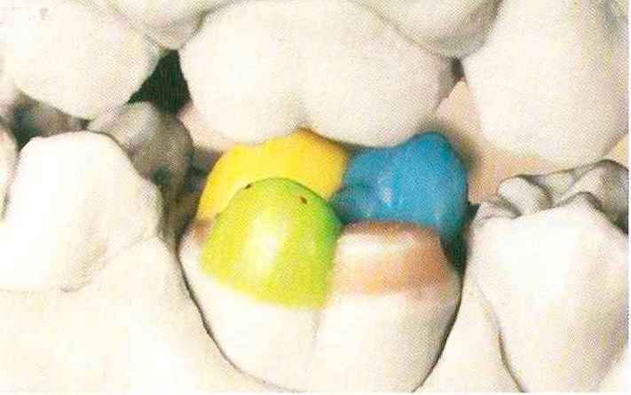 Треугольный выступ от вершины конуса медиального щечного бугорка должен быть направлен строго к вершине конуса медиального язычного бугорка, а не в центральную ямку (рис. 153— 158). моляра, причем сегмент пока остается вне контакта (рис. 151 и 152). |
