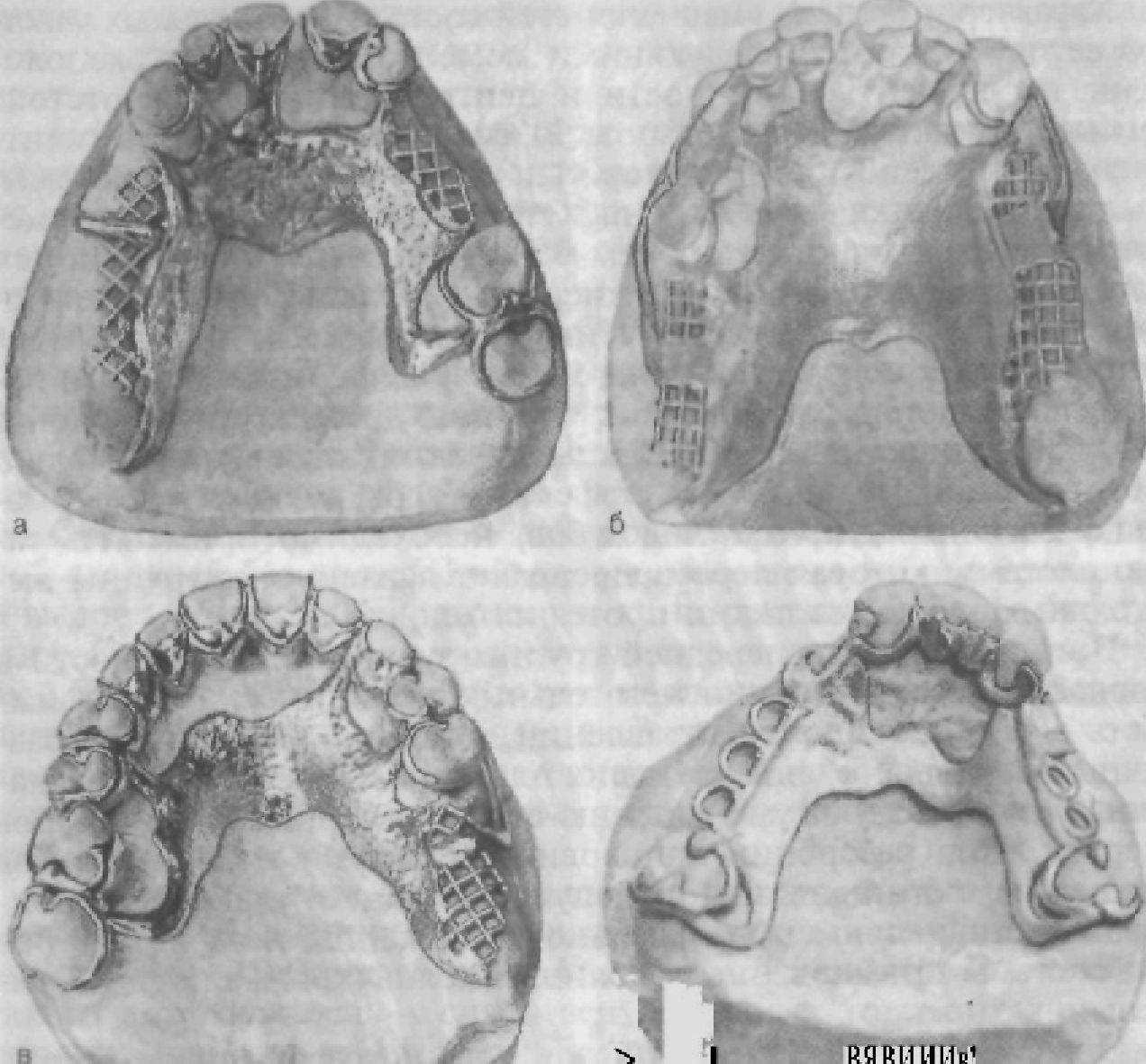 Рис. 174. Системы иммобилизирующих аппаратов, применяемых при пародонтите, осложненном отсутствием зубов.