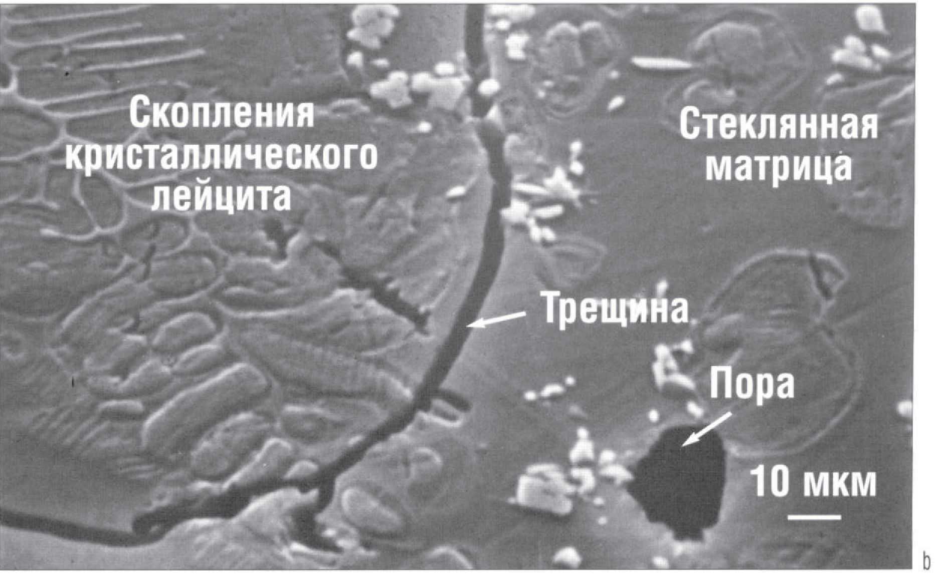Рис. 3.5.5. (а) Структура лейцитосодержащей керамики, используемой для изготовления металлокерамических зубных протезов. Обратите внимание на присутствие остаточной пористости. (Ь) Увеличенное изображение скопления лейцита и образовавшейся возле него трещины. Такое явление часто наблюдается из-за высоких расхождений между коэффициентами термического расширения кристаллического лейцита и стеклянной матрицы