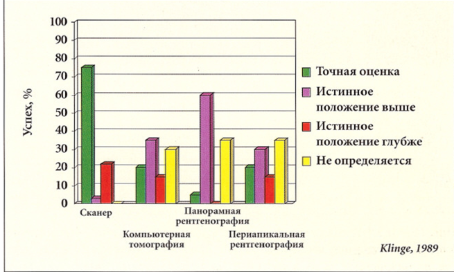 Рис. 18-3. Klinge и соавт. (1989) проверили точность локализации нерва с помощью сканирующего устройства. В 75% случаев сканер позволил установить его точное положение и в 20% определил его на более высоком уровне (неопасная погрешность). С помощью панорамной рентгенографии в 60% случаев положение нерва казалось более глубоким (опасная погрешность)