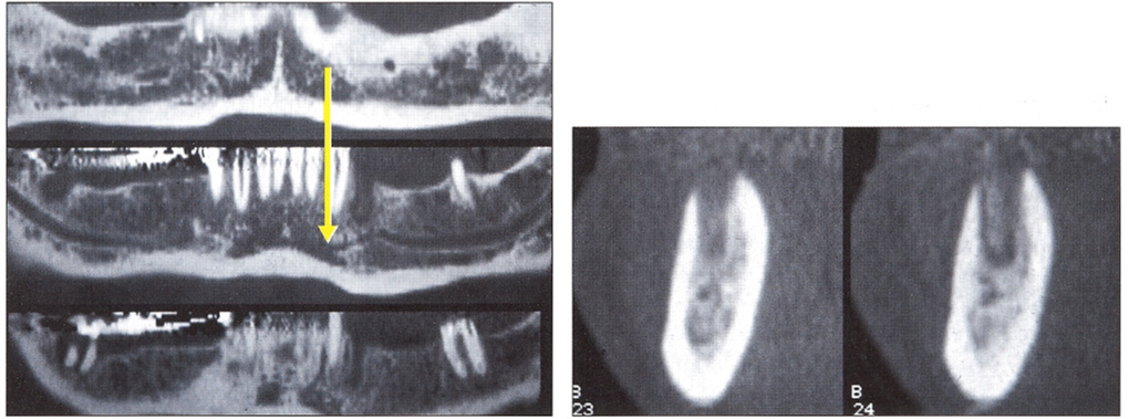 Рис. 18-4 и 18-5. На томограмме точно определяется положение нижнечелюстного канала, а также резцового канала (стрелка), который был обнаружен только благодаря этой методике.