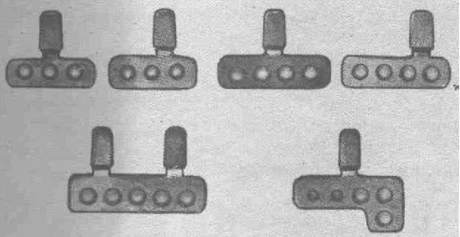 щади отверстий и всей площади имплантата. Фирмы "Fratronic Incorporation", "Ultimatic Incorporation", "Amec SA" выпускают наборы вариантов имплантатов для верхней и нижней челюстей. Изготавливать такое количество вариантов штамповочно-фрезерным способом очень дорого. G. Muratori и L. Linkow (1981) предлагают выпускать стандартные имплантаты-заготовки и в каждом случае подгонять их по рентгенограмме. Наш клинический опыт показал, что шести вариантов пластиночных ЭИ вполне достаточно для восстановления дефектов зубных рядов. Чаще всего использовались.