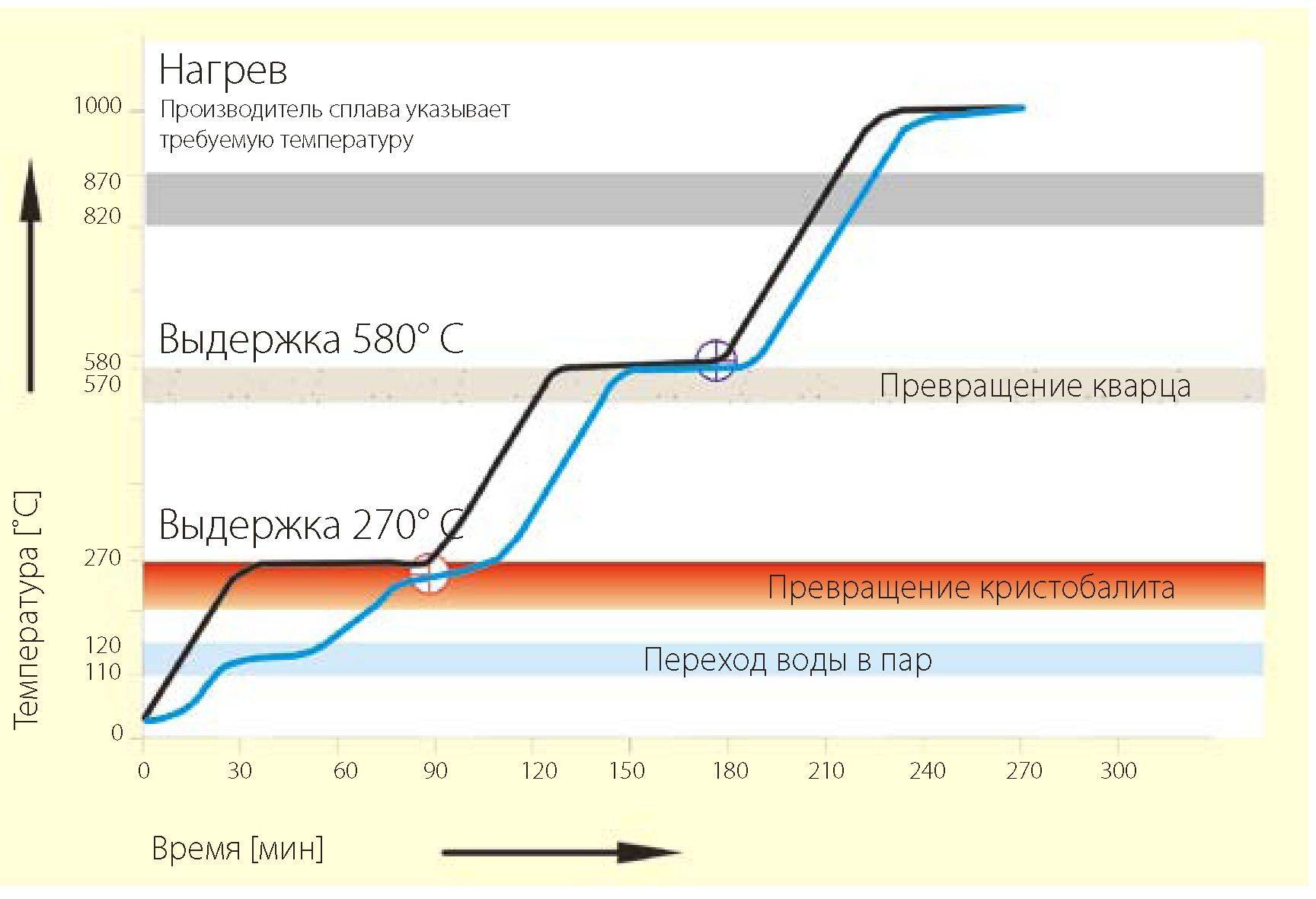 Составление температурных кривых предварительного нагрева Предварительный нагрев формовочной массы без опокового кольца из формы X3 Черная линия на графике соответствует изменению температуры формы при температуре 270° C в центре печи. Синяя линия указывает на изменение температуры в центре формы (отличающееся от изменения температуры печи). Температура предварительного нагрева достигается примерно через 30 минут при скорости ее подъема 8° C в минуту до температуры выдержки 270° C, в то время как в формовочной массе при 110° C только начинается процесс испарения. Форму достаточно долго выдерживают при этой температуре, и по достижении 120° C в ее центре испарение завершено. Только тогда температура в форме снова поднимается в течении 30 минут нагрева плюс 30 минут выдержки до максимального значения 265° C. После прохождения этой точки температура в муфельной печи может далее подниматься. Подогрев стального опокового кольца с синтетической прокладкой - форма X3 При применении формы со стальным опоковым кольцом и прокладкой из синтетического полотна, для преобразования кристобалита необходимо остановить повышение температуры в печи на отметке 300° C. Стальное опоковое кольцо с вискозной прокладкой замедляет теплоотдачу настолько сильно, что при температуре от 270° C фактическая температура формы ниже температуры печи всего на 40° C, то есть 230° C. При температуре выдержки формы в печи 300° C, формовочная смесь нагрета только на 35° C ниже. Предварительный нагрев можно провести и при имеющихся 265° C. Используемая в этом случае формовочная масса имеет более высокое содержание влаги. По этой причине время испарения увеличивается до 60 минут выдержки.