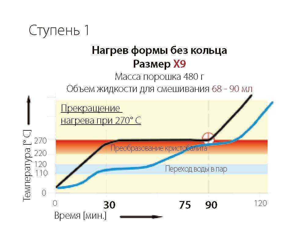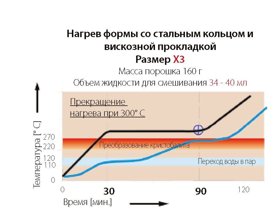 Эта диаграмма нагрева получена после сведения воедино предшествующих результатов физикохимических преобразований и графика повышения температуры в печи. Максимальное воздействие на компоненты формовочной массы оказывают периоды выдержки температуры. Именно они обеспечивают повторение качественных результатов литья и припасовки. Некоторые процессы подчинены физико-химическим законам и не могут изменяться по нашим желаниям. Нагрев формы со стальным опоковым кольцом и синтетической прокладкой X9 - 480 г порошка, 75 мл жидкости для смешивания