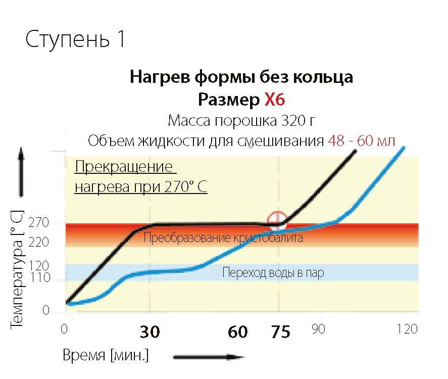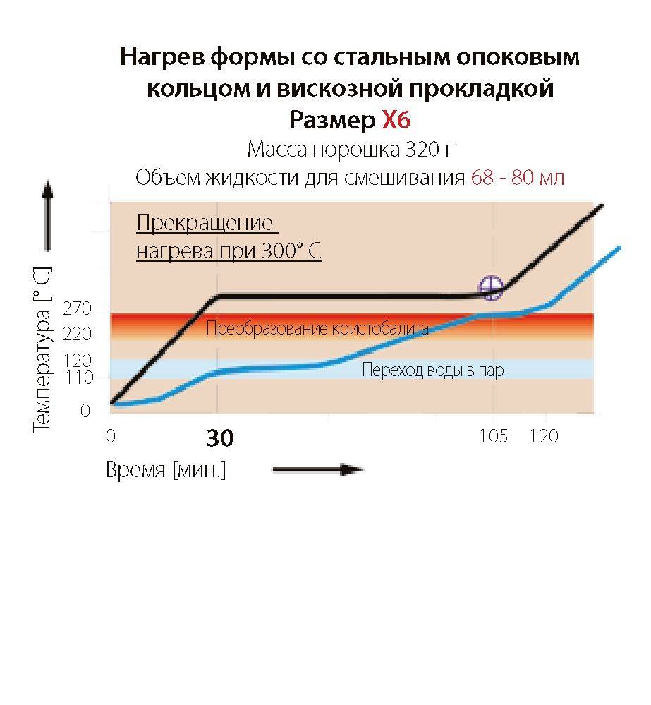 Нагрев формы без наружного опокового кольца X6 Если форму X6 нагревают до 270° C, то диаграмма ее нагрева изменяется. Большее количество порошка (320 г) требует и существенно большего количества жидкости (ок. 48-60 мл) в зависимости от вида формовочной смеси. На температурной кривой видно, что теперь процесс испарения замедляется, и форма дольше остается в температурном диапазоне между 110° C ... 120° C. Теперь время прокаливания составляет 30 минут нагрева плюс 45 минут выдержки, пока температура формовочной смеси в центре формы не достигнет 265° C. Только после этого увеличивают температуру нагрева в муфельной печи. При использовании стального опокового кольца с вискозной прокладкой нагрев прекращают в диапазоне 270° C ... 300° C (при применении той же самой формовочной массы). Выдержка и температурный режим не изменяется.
