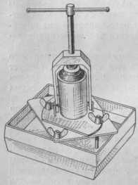 Одноместная шприц-кювета (рис. 12,13) состоит из следующих деталей: двух колец и дна стандартной кюветы; прижимной рамки с основанием (железная пластинка толщиной 4 мм, размером 120X60 мм) и 2 вертикальными стойками диаметром 8 мм, высотой 65 мм; загрузочной камеры с прижимной пластиной. Камера представляет собой цилиндр высотой 70 мм, с внутренним диаметром 36 мм, и толщиной стенок 2 мм. Прижимная пластина (из 4-миллиметрового железа, размером 105X95 мм) имеет на боковых сторонах произвольно расположенные овальные вырезы и 2 отверстия диаметром 9 мм; поршневого устройства, включающего дугообразную рамку, винт (диаметром 10 мм и длиной 120 мм, с шагом резьбы 1,5 мм) и резиновый поршень высотой 25 мм. Составные части кюветы удерживаются в рабочем положении с помощью барашковых гаек.