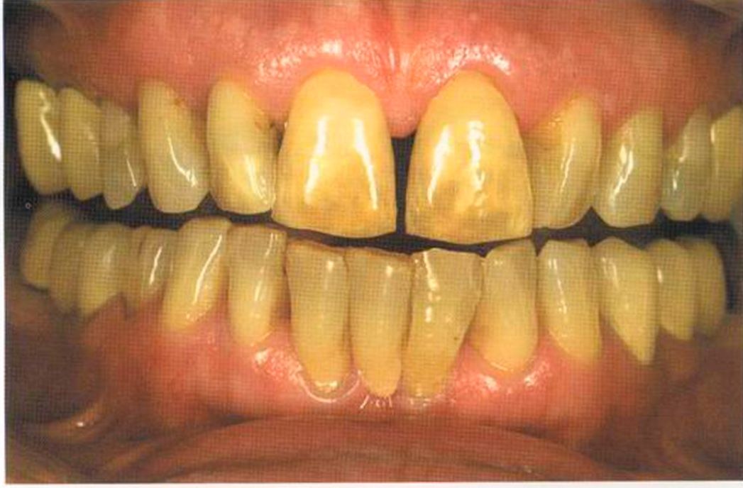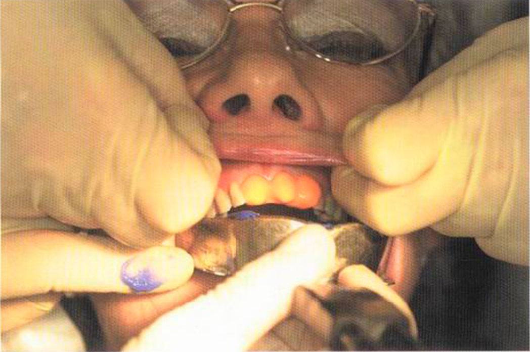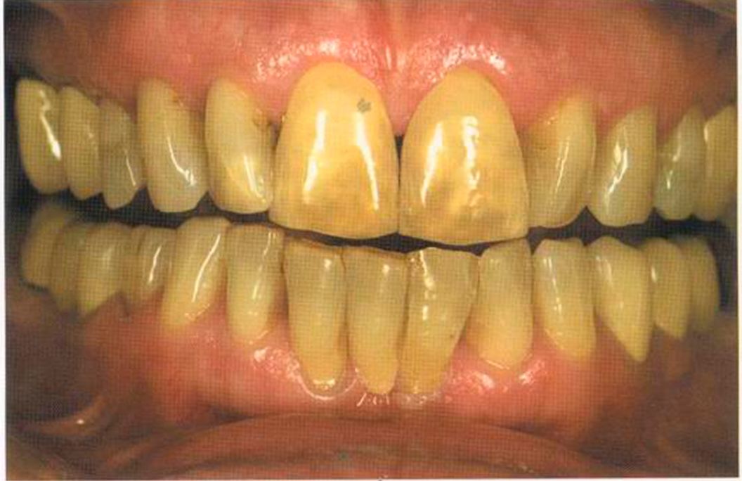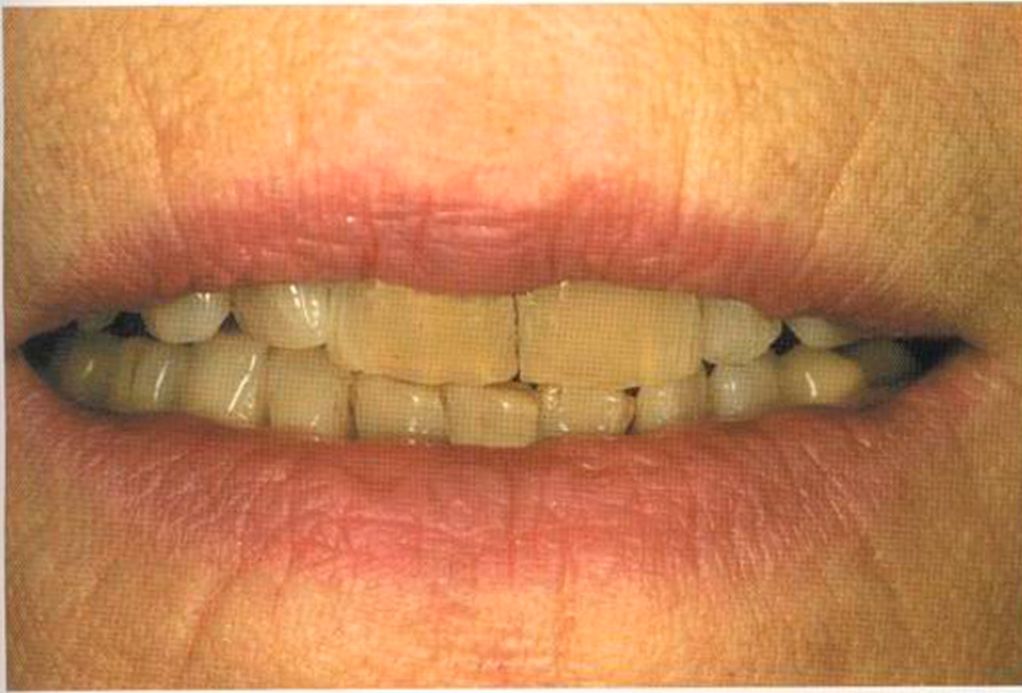 Этот пациент — португалец. Он всю жизнь имел такое положение зубов. Небнорасположенный боковой резец теперь необходимо удалить, а затем воссоздать как эстетику, так и функцию в области фронтальной группы зубов. Планируется изготовить коронки In-Ceram в области 11 и 21 и соединить их вместе из-за увеличивающейся подвижности зубов.