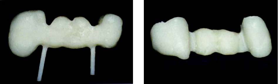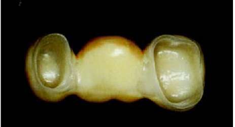 метрах обжига. Важно только отметить, что при изготовлении керамики путем наслоения апатита фтора мы ведем речь о материале, который требует обжига при температуре 760 — 800 °С. Более подробную информацию, вы можете получить из таблиц фирмы-производителя. После первого обжига мы вынимаем каркас нашего внимания из печи без его длительного охлаждения и ждем, пока он не достигнет комнатной температуры. После этого под микроскопом исследуются внутренние стороны коронок. Если на внутренней стороне остались излишние частицы керамики, которые попали на внутреннюю сторону при нанесении кисточкой массы для уплотнения, то их можно легко удалить алмазным шариком, после чего проводится примерка на остове.