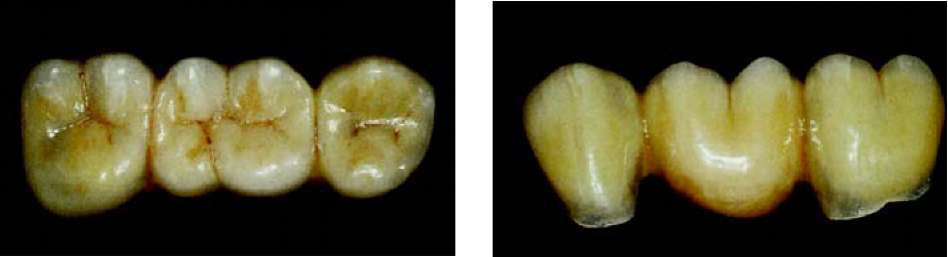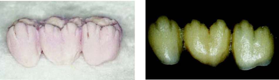 Рис. 63 и 64. Мост, покрытый глазурью. После этого проводится шлифование контактных пунктов с соседними зубами и, в случае необходимости проводится корректировка с помощью алмазного бора. Когда после этого мост садится на модель без какого-либо сопротивления, теперь в артикуляторе мы можем проконтролировать окклюзальную сторону и, в случае необходимости, с помощью алмазного шарика провести корректировку. В зависимости от степени уплотнения, нанесенной при наслоении керамической массы — готовая обожженная керамика в большей или меньшей степени уменьшается в объеме, и должна быть подкорректирована нанесением новой керамики (корректировочный обжиг с применением массы Add-on) и ее обжигом. Но прежде чем вновь наносить керамику, мы обрабатываем керамическую (пескоструйный аппарат) поверхность 110 мц оксида алюминия при давлении 2 бар и для очистки используем пароструй. Теперь мы дополняем недостающие части или уменьшенные в объеме межзубные области слоями керамики (масса add-on 780°С), вновь их уплотняем и производим обжиг моста во второй раз при максимальной температуре 780 °С. После этого проводится та же процедура, что и после первого обжига. Когда форма, посадка и окклюзия завершены, мы переходим к оформлению поверхности. Теперь прорабатываются аппроксимальные края буккальных поверхностей, а также текстура. Как ориентир мы используем естественные зубы пациента. Можно исходить из того, что у более возрастных пациентов. Поверхность зубов более гладкая, чем у более юных пациентов. У последних нам часто встречаются поперечные структуры, в виде неравномерных волн. Речь идет о перикиматиях, которые с течением времени гладко полируются и становятся практически невидимы. Если они сохранились в оставшихся зубах пациента, мы имитируем их с помощью тонких, алмазных шариков, для достижения эффекта «черепицы», наложенной друг на друга. |