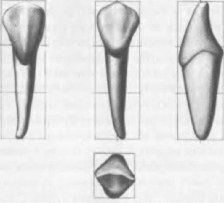 Скаты режущего края от главного бугорка у клыков нижней челюсти, как правило, расходятся под тупым углом или близким к прямому. Мезиальный скат чаще всего короче дисталыюго и располагается менее отвесно. Апроксимальные контуры коронки слабо конвергируют к условной срединной вертикали по направлению к шейке зуба, но иногда они располагаются почти отвесно, придавая коронке более удлиненную форму. Дистальный угол коронки закруглен и расположен ближе к шейке зуба, чем мезиальный.
