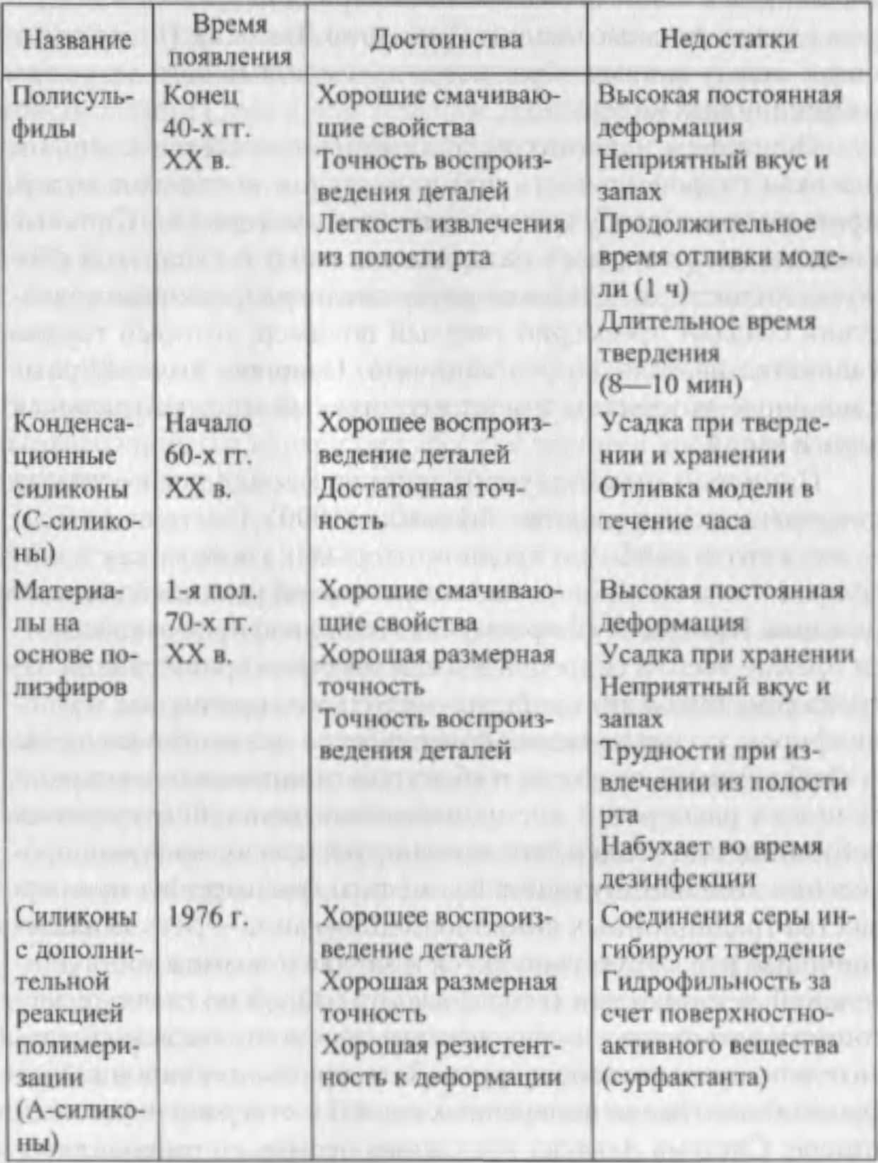 Основным нсдостаком полиэфиров является слишком высокая гидрофильность при длительном контакте с водой, приводящая к разбуханию слепочиого материала. Сильные кислоты могут вызвать раздражение кожи и слизистой оболочки полости рта. Сильные внутримолекулярные взаимодействия создают чрезмерно твердый полимер, который трудно удаляется из полости рта пациента. Наконец, полиэфирные слепочныс материалы имеют неприятный или нейтральный вкус и запах.
