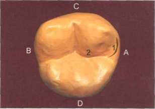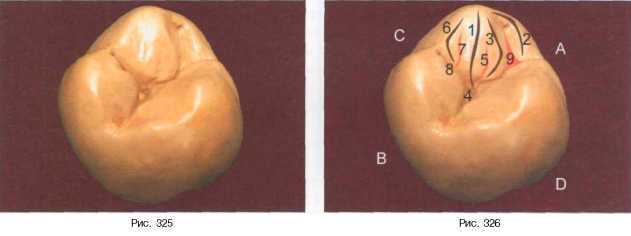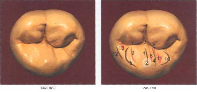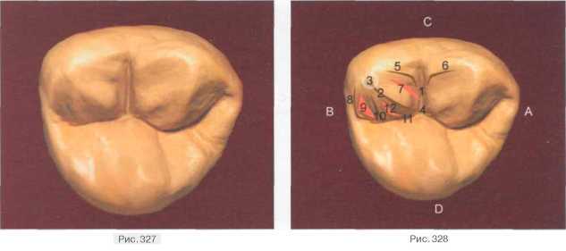 Между медиальным валиком и щечной частью медиального краевого гребня определяется хорошо выраженное углубление треугольной формы (передняя триангулярная ямка — 9). Углубление (5), разделяющее продольный и медиальный валики, хорошо выражено и направлено в центральную ямку. Дистальный валик (6) моделируем треугольной формы с самостоятельной вершиной, отделенный от основного валика своеобразным дистальным углублением (7), впадающим в вестибулярную борозду (8). Дистальный щечный бугорок (метаконус) отделен от медиального щечного вестибулярной фиссурой(1)(рис. 327, 328).