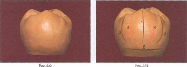 Вестибулярной бороздой (1), спускающейся с жевательной поверхности до границы окклюзионной и средней третей, разделяем контуры щечных бугорков. Каждый из которых оформляем как самостоятельное образование-одонтомер, с присущими ему морфологическими элементами: тремя валиками и двумя углублениями. Все валики начинаем выкладывать от вершин бугорков в направлении шейки зуба. Моделированием продольных валиков вдоль поверхности создаем основную выпуклость зуба. Краевыми валиками ограничиваем щечную поверхность с контактных сторон. Дистальный валик медиального бугорка (6) и медиальный валик дистального бугорка (7) выкладываем с обеих сторон от вестибулярной борозды. В пришеечной трети моделируем выпуклый экватор. Со стороны небной поверхности оформляем контуры соответствующего бугорка-одонтомера (рис. 333, 334). От его вершины в направлении шейки выкладываем три валика и два, разделяющих их,углубления.