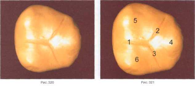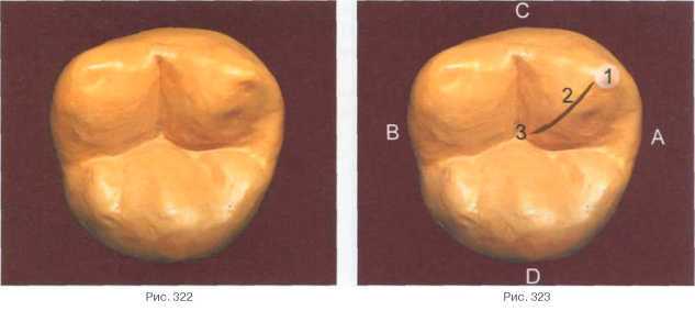Предварительно наносим линии расположения фиссур: вестибулярная (1), медиальная (2), дистальная (3) (рис. 320, 321)