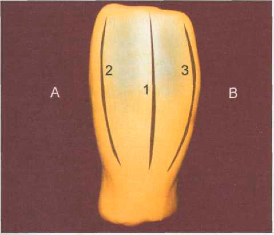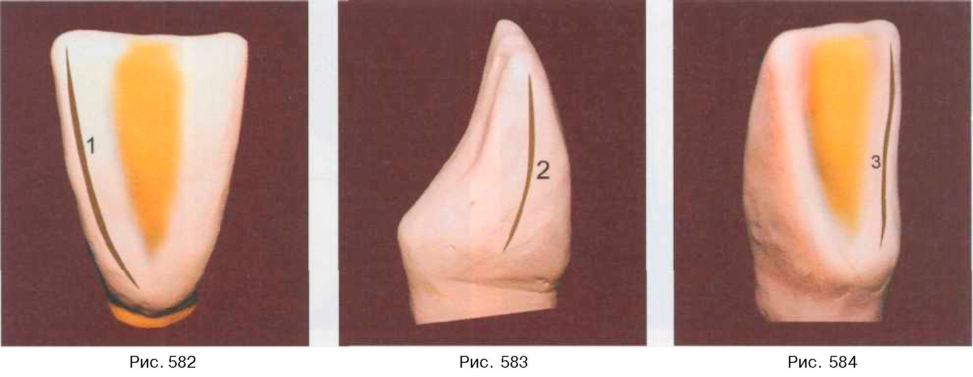 части коронки форму долота (рис. 579). Далее наносим часть пластилина и на контактную поверхность, формируя дистальную грань (2), где уже более четко прослеживается ее наклон от шейки к режущему краю коронки (рис. 580). Заканчиваем моделирование дистальнои части коронки нанесением материала на язычную поверхность (3). Здесь уже выделяется часть язычного бугорка, оформляется краевой валик с язычной поверхности, имеющий определенный изгиб в средней трети коронки (рис. 581). Далее формируем медиальную часть коронки 31 зуба. Аналогично дистальнои части зуба моделируем краевой валик (1) по вес-