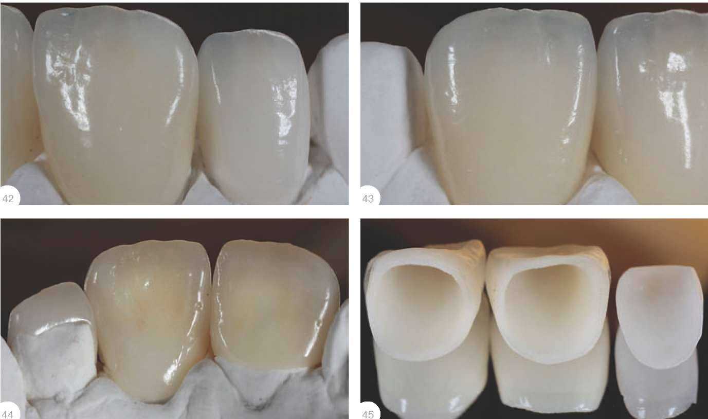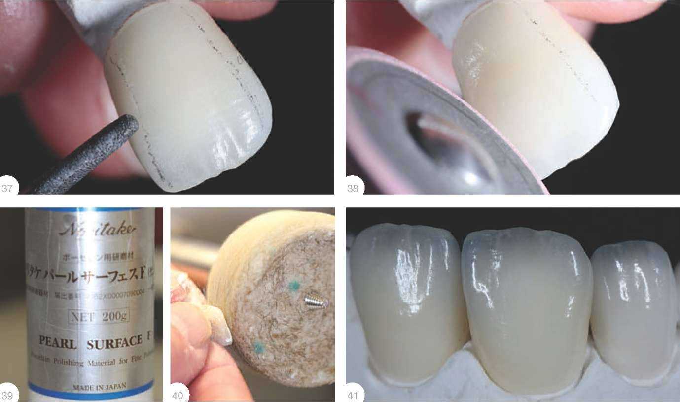 Поэтому каждый зубной техник опытным путем находит нужную температуру. В данном случае температура составил 925°С при выдержке 30 секунд. В результате поверхность имеет «сахарную» текстуру, все эффекты хорошо видны и прозрачность не нарушена. Далее контурируем (рис. 37), при необходимости проводим коррекцию. Обрабатываем традиционным способом - алмазными камнями - для придания зубу соответствующей текстуры (рис. 38). Для большей наглядности используем маркер или карандаш. Глазурование и полировка После глазурования поверхность полируется специальными полировочными средствами (рис. 39). Я предпочитаю использовать материал Pearl Surface (Noritake) даже по названию понятно, что он создает естественный глянец и придает зубам натуральный вид. |