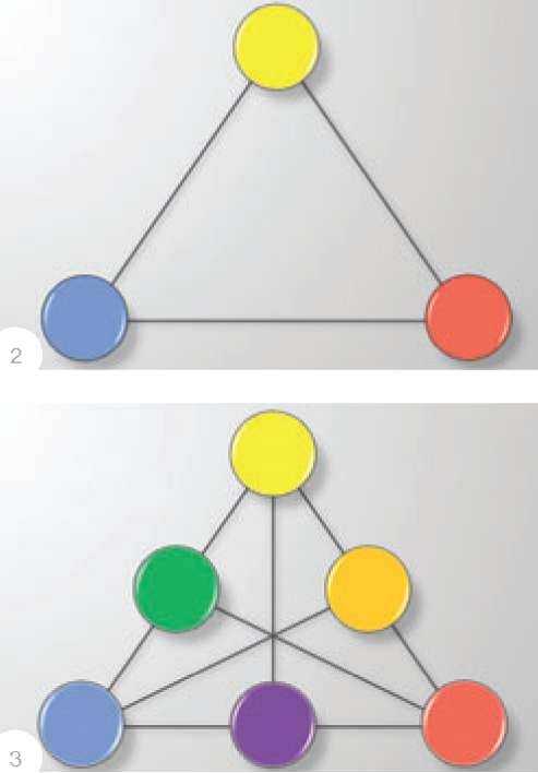 Есть и четвертая, пространственная, со ставля ющая - прозрачность которая была введена позже, и о которой мы не будем говорить сейчас. Если коротко, суть шкалы Манселла заключается в том, что существуют три основных оттенка субтрактивного цветового синтеза - красный, желтый и синий. При смешивании основных оттенков мы получаем вторичные - зеленый, оранжевый и фиолетовый цвета. Представьте себе треугольник, в вершинах которого расположены основные цвета (рис. 2). Между ними образуются вторичные. Таким образом, по биссектрисе напротив каждого основного цвета расположен вторичный, который и является взаимодополняющим или комплиментарным к этому основному (рис. 3). Будучи расположены рядом, взаимодополняющие оттенки воспринимаются наиболее динамично и контрастно, а их соединением можно получить составной серый, ахроматичный. |