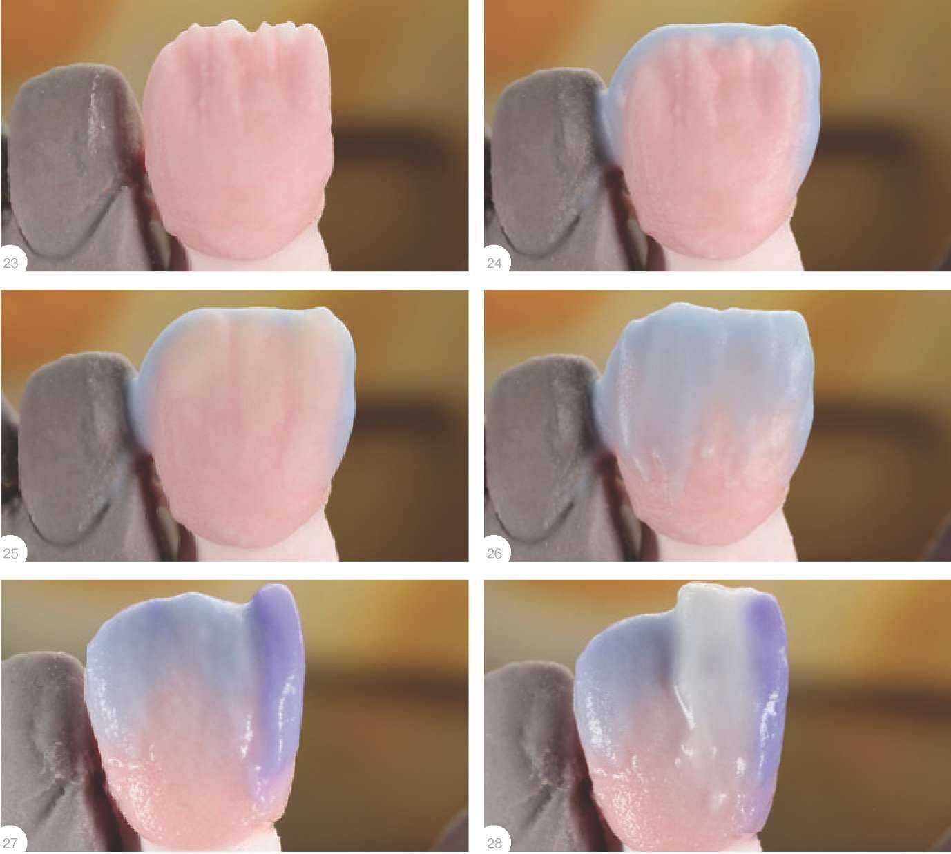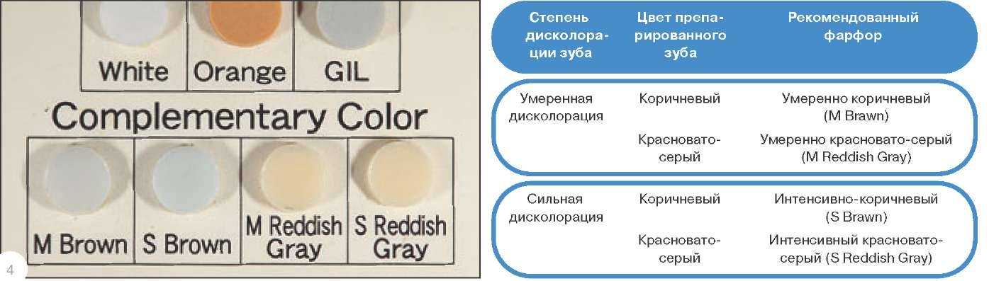 Фирма Noritake разработала методику, которая позволяет применять этот эффект в стоматологической практике. Ее суть состоит в том, что ярко выраженный оттенок зуба, например, красный или красно-коричневый, можно блокировать взаимодополняющим цветом и таким образом получить нейтральный серый, на который мы сможем накладывать выбранный цвет конечной реставрации.