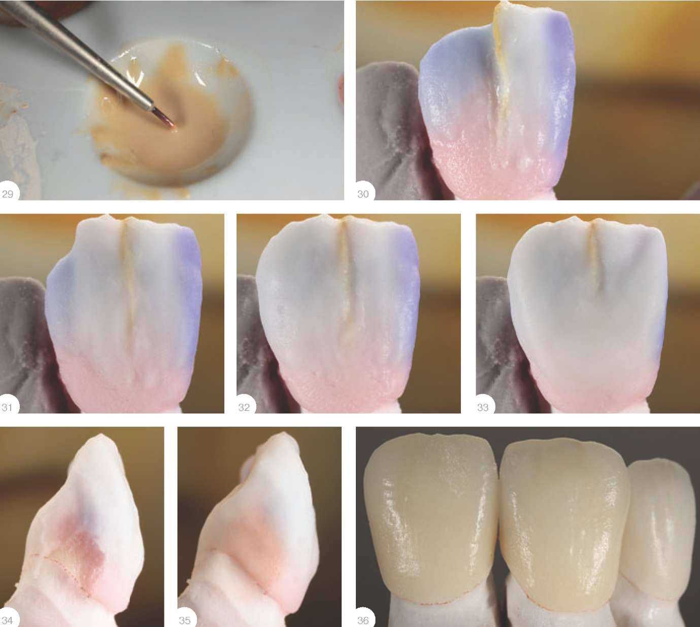 Получается мягкий рисунок наподобие «облаков». Затем закрываем дентиновые слои эмалевой резцовой массой и приступаем к работе с люстровым фарфором. Оформление медиального края начинают с голубого люстрового фарфора, затем в зависимости от конкретной ситуации укладывают либо LT-N, либо LT-0 - это называется техникой латерального сегментирования. Если я хочу имитировать сегментную латеральную трещинку, то я более четко оформляю эту зону материала кисточкой или режущим инструментом и наношу краситель. Для этого у меня есть специальная кисточка, которая позволяет очень тонко нанести материал, избегая его внедрения в данный слой - краска должна очень четко лежать по границе керамики (рис. 29).