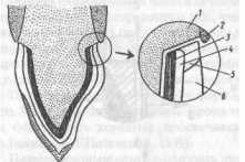 Рис. 12. ТепеIрафическее соотношение уступа, цельнолитого каркаса и слоев фарфорового покрытия по САбакарову: 1 — пришеечная часть опорного зуба; 2 — десна; 3 — цельнолитой каркас;.