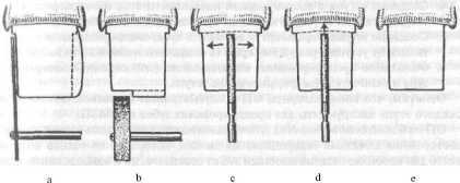 Рис. 9. Последовательность препарирования опорного зуба по С.ИАбакарову: а — сепарация проксимальных поверхностей; b — укорочение коронковой части на 1/5 высоты; с - препарирование вестибулярной и оральной поверхностей; d — доведение пришеечного уступа до заданного уровня; е — опорный зуб после завершения препарирования