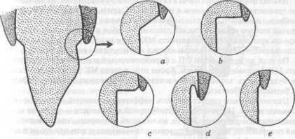 Рис. 10. Различные виды пришеечных уступов по САбагарову: а — под углом 35°; b — под углом 90°; с — под углом 90° со скосом 45°; d — желобообразный уступ; е — символ уступа