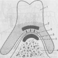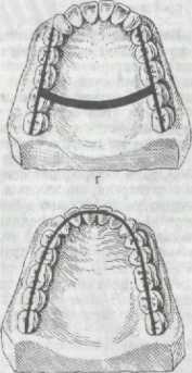 Вторая группа — протезы, опирающиеся на беззубые альвеолярные отростки челюстей и небо, — пластиночные протезы, передающие нагрузку через ткани, не приспособленные к нагрузке (рис. 298,6).