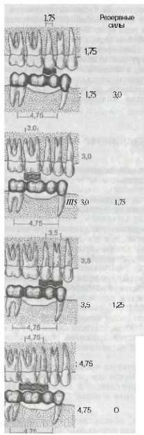 Рис. 300. Изменение резервных сил пародонта опорных зубов мостовидного протеза и силовых соотношений между антагонирующими группами зубов в зависимости от величины куска пищи и места его расположения.