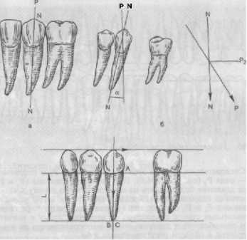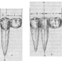 Несколько иные механические условия для восприятия пародонтом нагрузки возникают в том случае, если опорные зубы расположены с промежутком. В приводимом примере нагрузка, падающая на плечо а (по отношению к оси N—N опорного [5),.