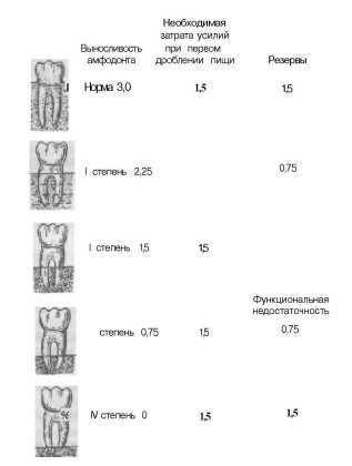 пародонта зуба к нагрузке, со средними усилиями, необходимыми для первого дробления пищи, можно сделать вывод, что пародонт отдельного зуба обладает запасом резервных сил, по меньшей мере равным усилиям, затрачиваемым для размельчения пищи в физиологических условиях. Подобно тому как одна почка, одно легкое может работать с двойной нагрузкой, пародонт одного зуба может вынести нагрузку, приходящуюся на два зуба.