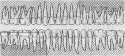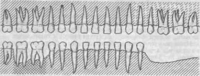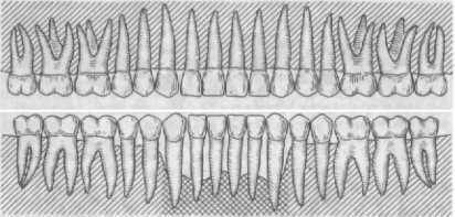 При том же блоке наступает разгрузка жевательных зубов в поперечном направлении при разжевывании пищи за счет фронтальных зубов, расположенных перпендикулярно к жевательным зубам (см. рис. 301).