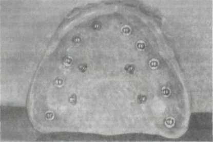 Рис. 273. Пластмассовая пластинка, изготовленная методом вакуумной компрессии, с закрепленными в ней металлическими шариками (диаметром 5 мм) для рентгенографического исследования костной ткани в области предполагаемой имплантации.