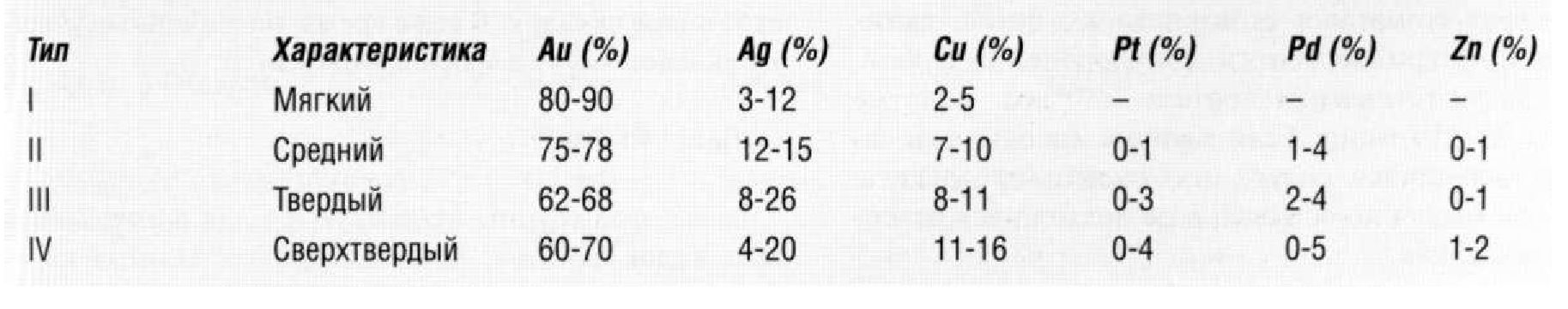 Хотя, в целом, сплавы со средним содержанием золота являются подходящей альтернативой золотосодержащим сплавам IV типа, но их свойства нестабильны и изменяются от сплава к сплаву, что отличает их от всех четырех типов сплавов с высоким содержанием золота (Таблица 3.3.4).