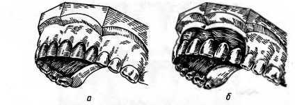 Начинают с передних зубов. Если альвеолярный отросток выражен хорошо, то зубы пришлифовывают, притачивают к альвеолярному отростку так, чтобы создать впечатление естественных. Такая постановка называется постановкой с приточкой (рис. 135, о). Плотно к десне могут быть пришлифованы и первые премоляры верхней челюсти. Подобная постановка отвечает эстетическим требованиям. При значительной атрофии или дефекте альвеолярного отростка передние зубы приходится ставить на искусственной десне, что проще и не так трудоемко, но, как правило, менее эстетично (рис. 135,6). Искусственному зубу вначале придают нужную ширину, потом припасовывают его к десне и в последнюю очередь притачивают к антагонистам для плотного контакта без повышения прикуса. Притачивание искусственного зуба производится на шлифмоторе карборундовыми камнями, а при незначительной приточке — фрезами, карборундовыми камнями, алмазными кругами или фасонными головками при помощи бормашины. При работе на шлифмоторе необходимо прочно удерживать зуб большими и указательными пальцами обеих рук, чтобы обрабатываемая поверхность была хорошо видна. Нагретым зуботехническим шпателем размягчают восковой валик и прикрепляют к нему центральные, потом боковые резцы, клыки и т. д.