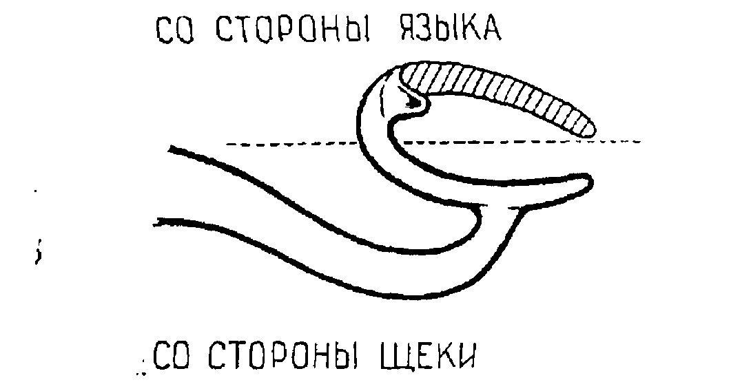 При оральном наклоне премоляра направляющая линия на язычной (нёбной) стороне находится вблизи жевательной поверхности. Здесь плечо кламмера пересекает линию наибольшей выпуклости и продолжается в десневой зоне до ретенционной точки с орально-мезиальной стороны премоляра. Глубина захвата для вестибулярного одноплечего кламмера должна равняться 0,25 мм. Так же, как и в оральном одноплечем кламмере, с дистальной стороны опорного премоляра плечо не соединяется с базисом. Для этого рекомендуется ^ручную сепарационным диском разъединить базис от кламмера.