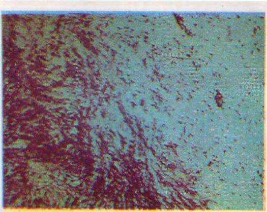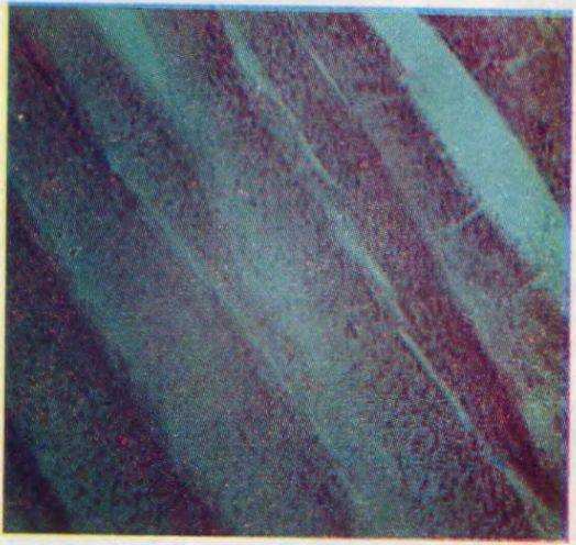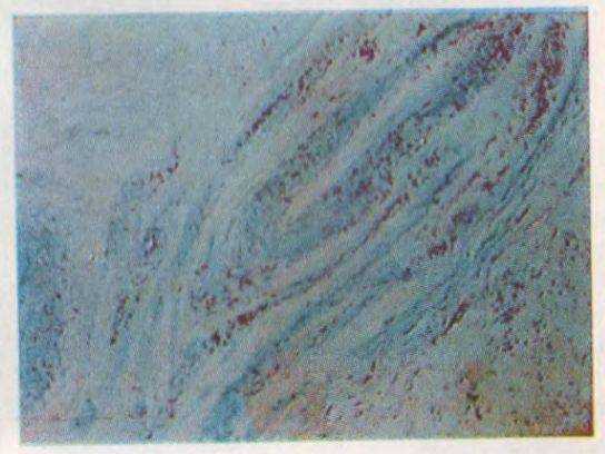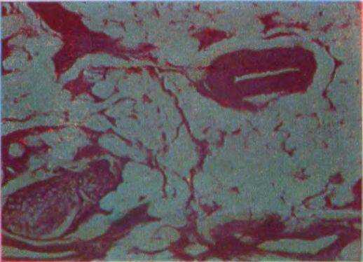 К стр. 125 Рис. 26. Соединительная ткань слизистой оболочки альвеолярного отростка нижней челюсти мужчины 79 лет с полной потерей зубов, не пользовавшегося съемными пластиночными протезами. Накопление кислых мукополисахаридов в стенках сосудов и межуточном веществе. Окраска по Хэйлу. Х120 (ШаНмерденова Р. Ш.).