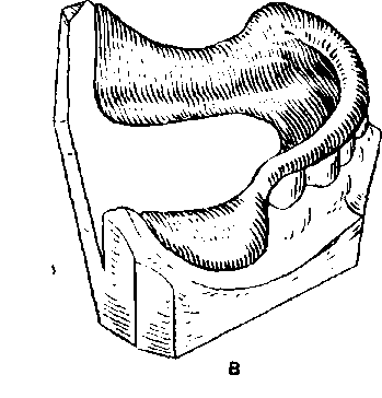 2-й тип (д, е) — альвеолярный отросток с атрофией различной выраженности имеет округлую или несколько заостренную форму. На язычной поверхности видна продольная складка, часто сочетающаяся с продольной складкой, идущей по середине альвеолярного отростка. Последняя складка легко смещается. 3-й тип (ж) — альвеолярный отросток атрофирован. На язычной поверхности имеется продольная складка, налегающая иа протезное ложе. Она может.