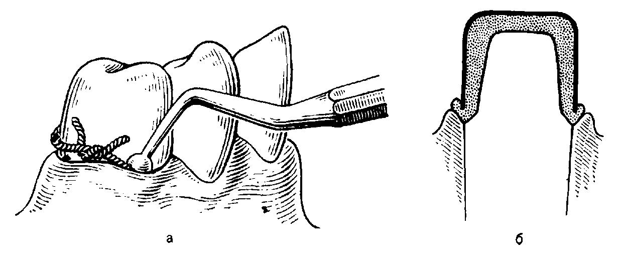 Рис. 8. Расширение дееневого кармана путем введения нити (а) и колпачком с термопластической массой (б).