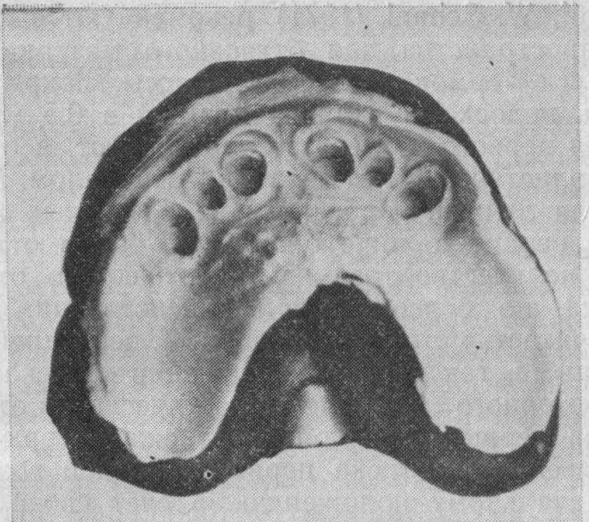 Видны четкие отпечатки шеек и уступов по вестибулярной поверхности зубов (В. И. Буланов).