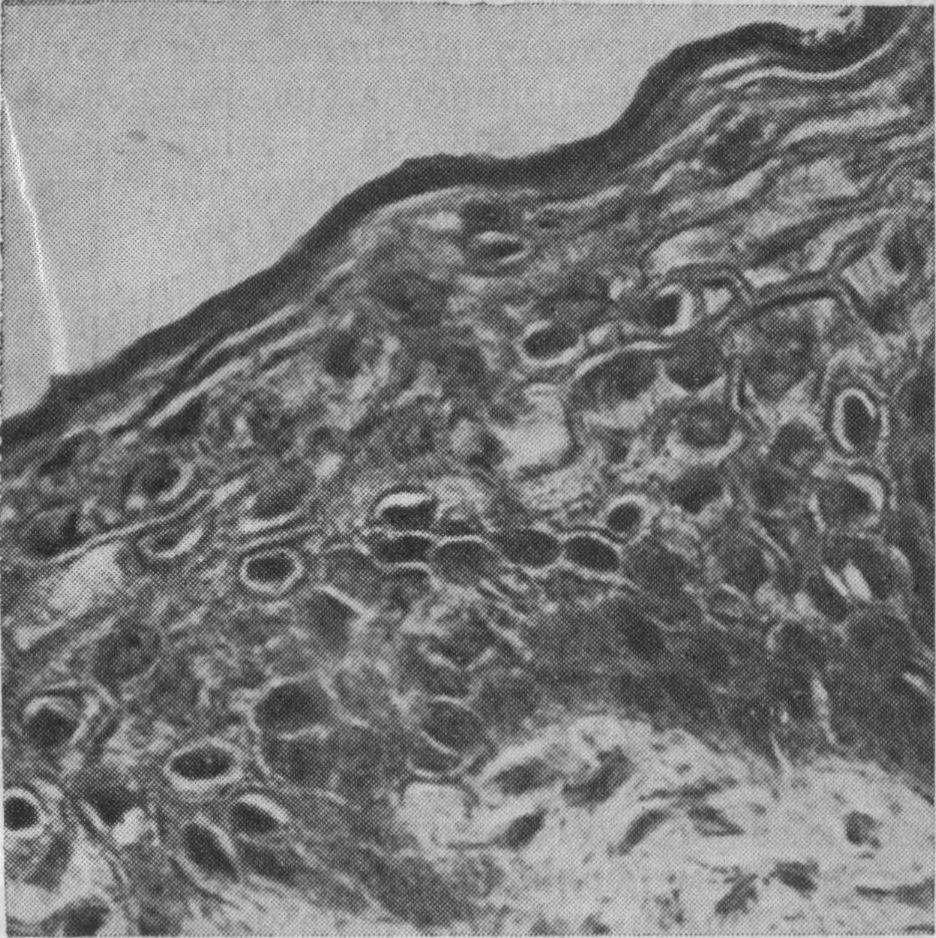 Особое внимание было обращено на состояние поверхностной части эпителия, так как мнения авторов о наличии рогового и зернистого слоев расходятся. По нашим данным, поверхностные ряды клеток эпителия у плодов (рис. 11) и большинства новорожденных находятся в состоянии паракератоза и лишь в некоторых случаях наблюдается истинное ороговение. Явления паракератоза отмечала и Н. Дамова (1964), но ороговения не выявила.