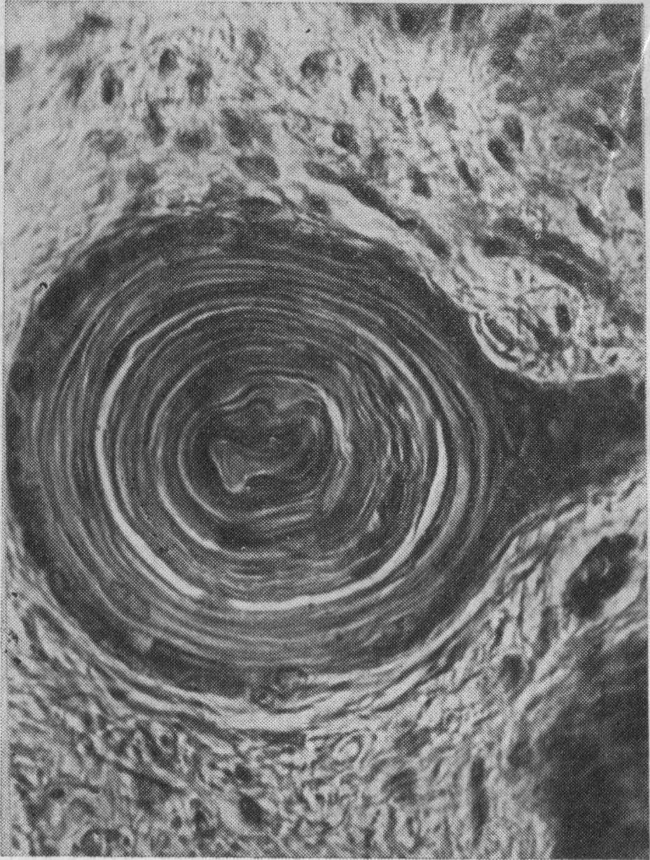 н поздний типы жемчужин. Первый тип обнаруживается у эмбрионов длиной 3—5 см, жемчужины состоят из темных однородных клеток с шарообразным ядром, в котором четко видны глыбки хроматина. Затем периферические клетки сплющиваются и вытягиваются и образуют вокруг ороговевающих осевых клеток концентрические слои. Этот поздний тип эпителиальных жемчужин имеет более крупные размеры и выявляется у плодов длиной 25 см. Затем они постепенно уменьшаются, резорбируются и в дальнейшем не обнаруживаются. Чрезвычайно редко зрелые эпителиальные жемчужины встречаются в пожилом возрасте. По данным М. А, Ребровой, они (см. рис. 12) встречаются у детей, юношей и у лиц пожилого возраста, не пользовавшихся съемными пластинчатыми протезами.